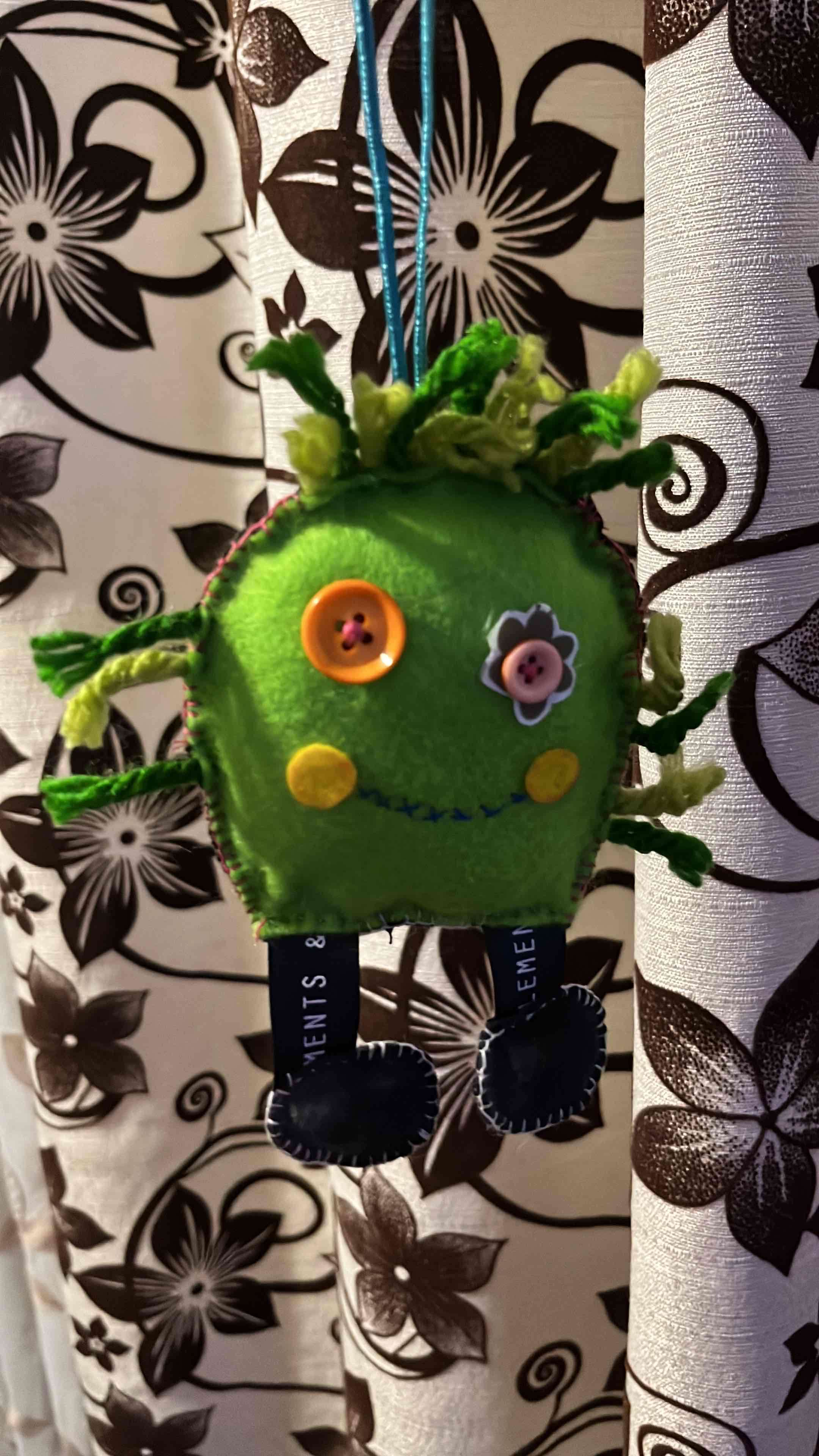 Decorativo colgante de tela verde con detalles de botones y lana. Ideal para decorar espacios o regalos. Hecho completamente a mano🩷