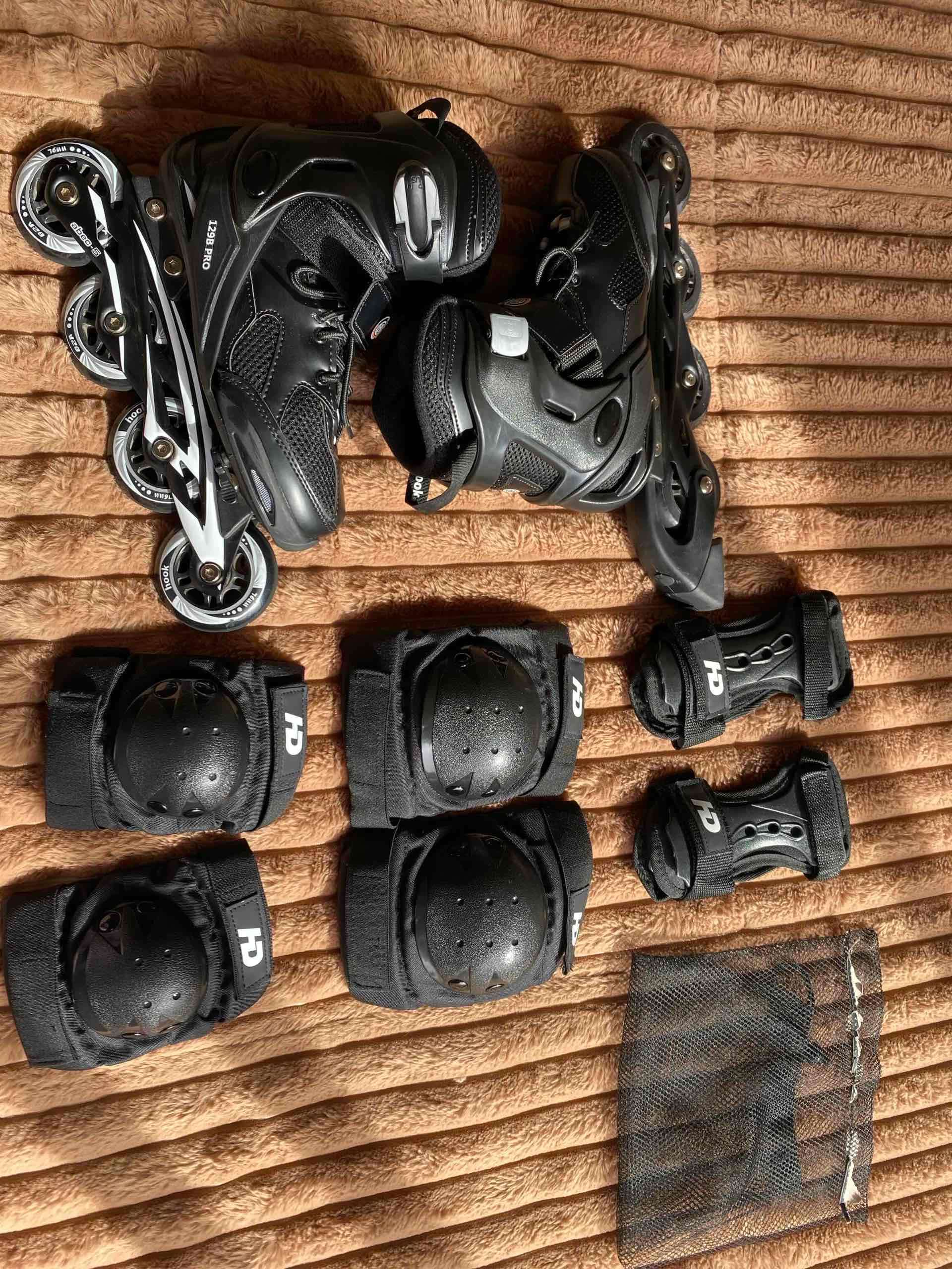 Conjunto de patines en línea negros con juego completo de protecciones. Ideal para principiantes.