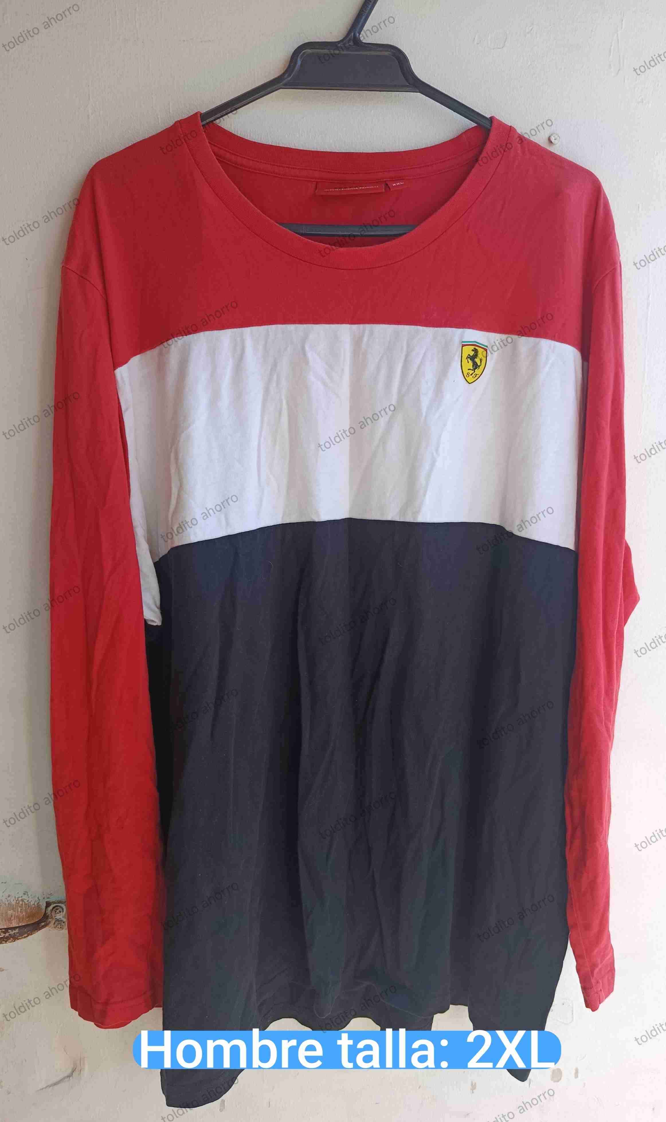 Polera manga larga en rojo, blanco y negro estilo Ferrari. En buen estado, ideal para uso casual.