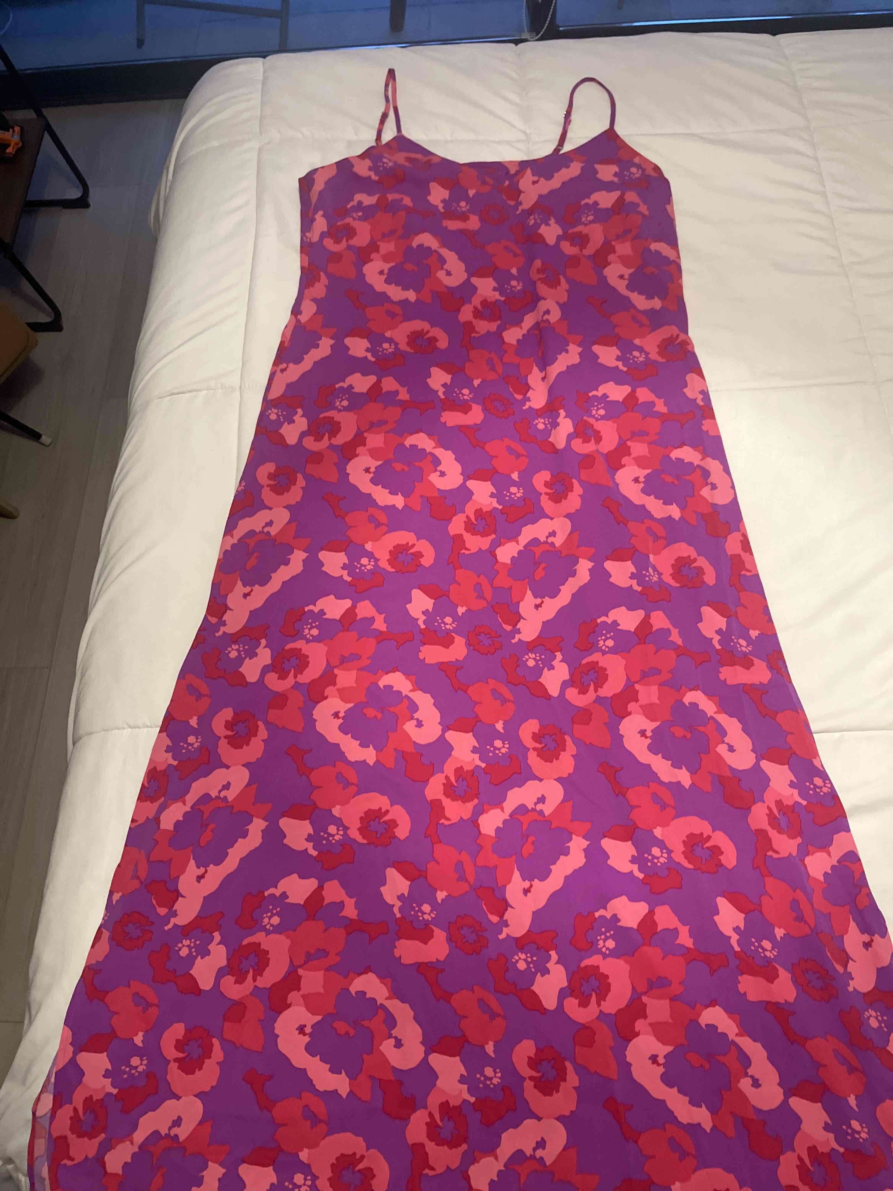 Vestido largo de tirantes con diseño floral en tonos rosa y morado. Ideal para el verano. Buen estado, ligero signo de uso.