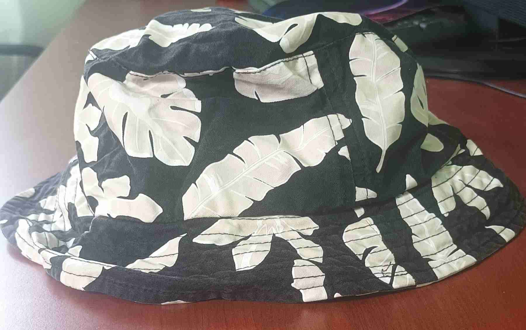 Sombrero estilo pescador con diseño de hojas blancas. Ideal para el verano, en buen estado. Composición: Exterior y forro 100% algodón.