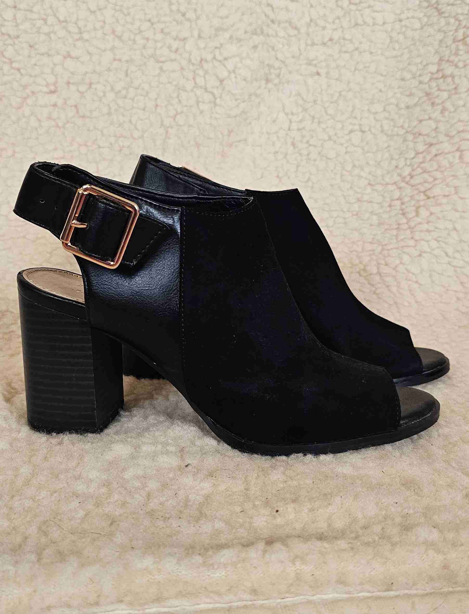 Elegantes botines negros con diseño abierto y hebilla dorada. Ideales para ocasiones formales o casuales. En buen estado.