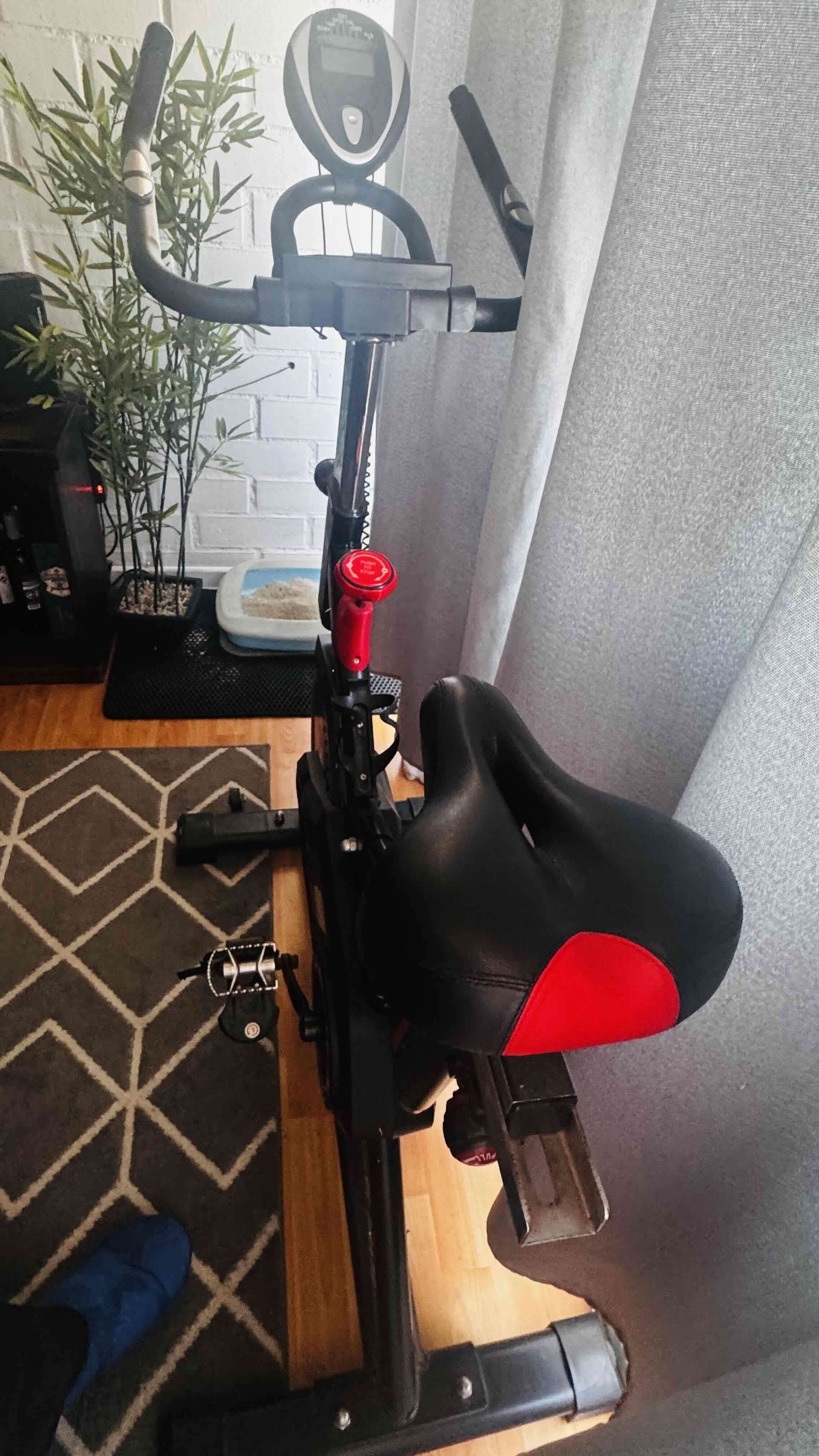 Bicicleta estática ideal para ejercicio en casa. Buen estado, practicamente sin detalles, color negro y rojo, con asiento cómodo. Perfecta para mantenerte activo.