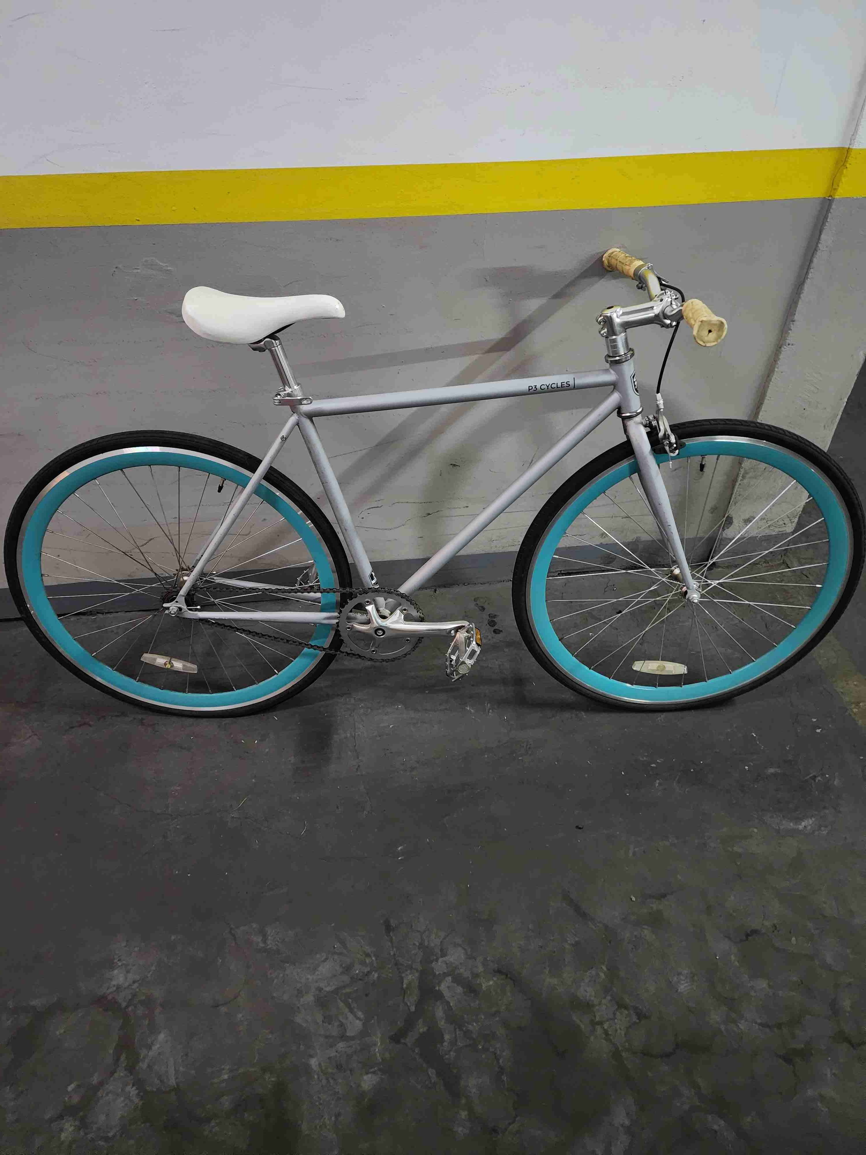 Bicicleta urbana marca P3 cycles gris y turquesa