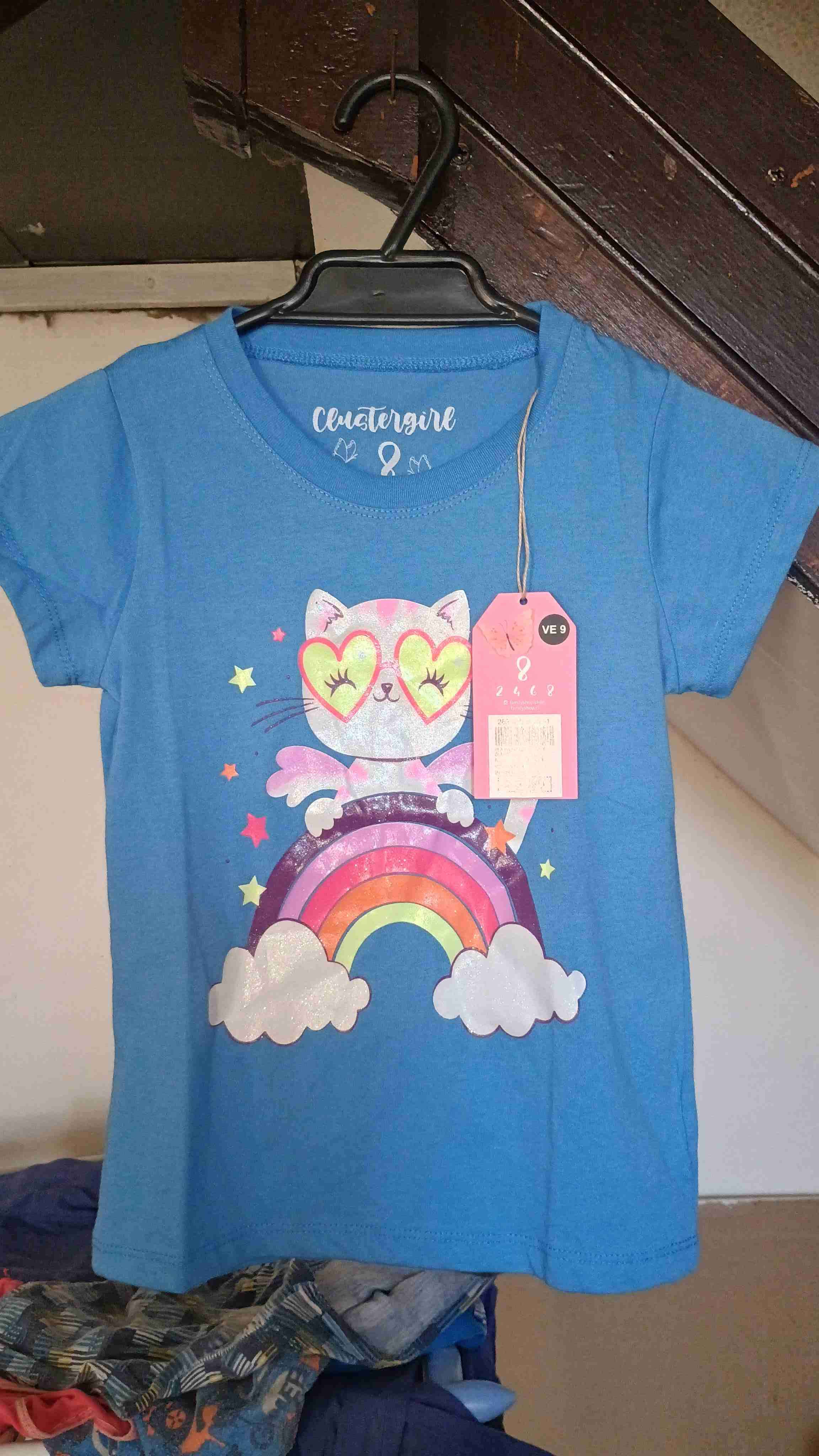 Linda polera azul para niño con diseño colorido de gato y arcoíris. Ideal para el verano. En buen estado.