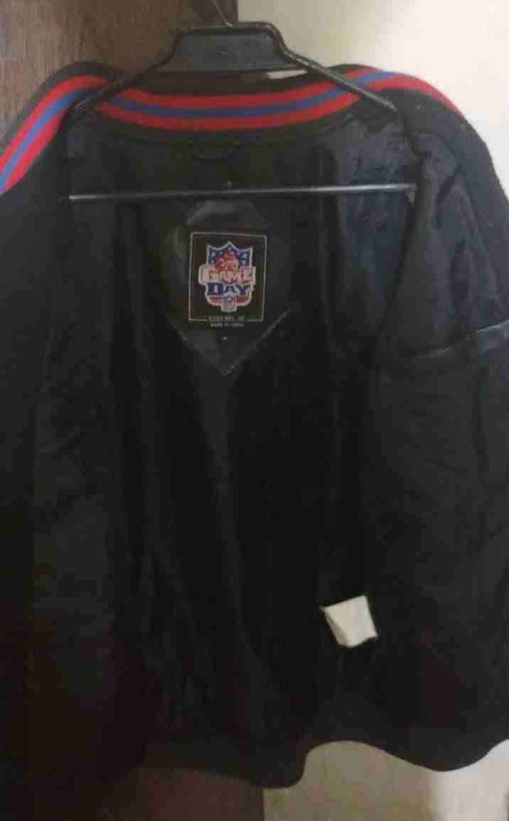 Chaqueta negra deportiva con detalles rojos y azules, en buen estado. Ideal para un look casual y cómodo.