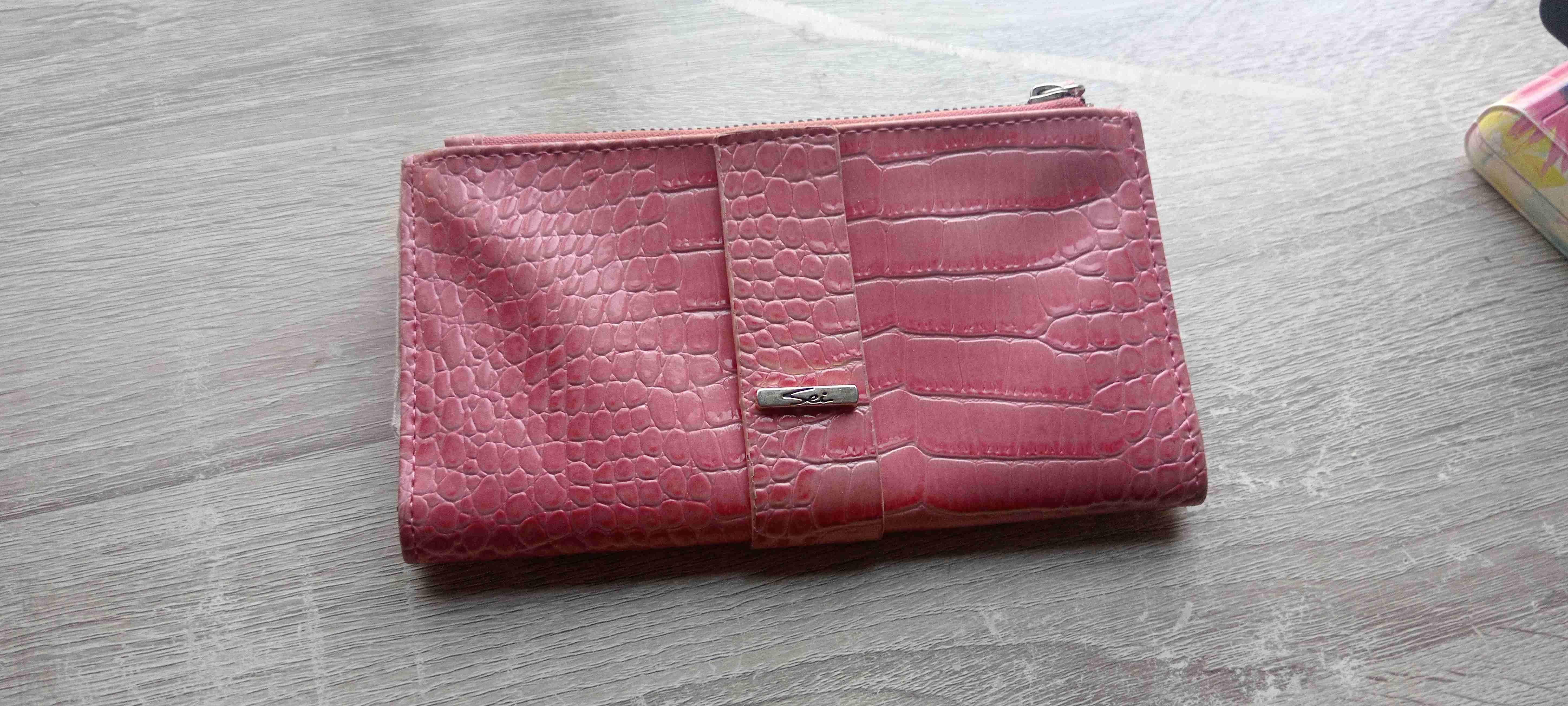 Billetera rosada con textura de cocodrilo, ideal para salidas casuales. En buen estado general.