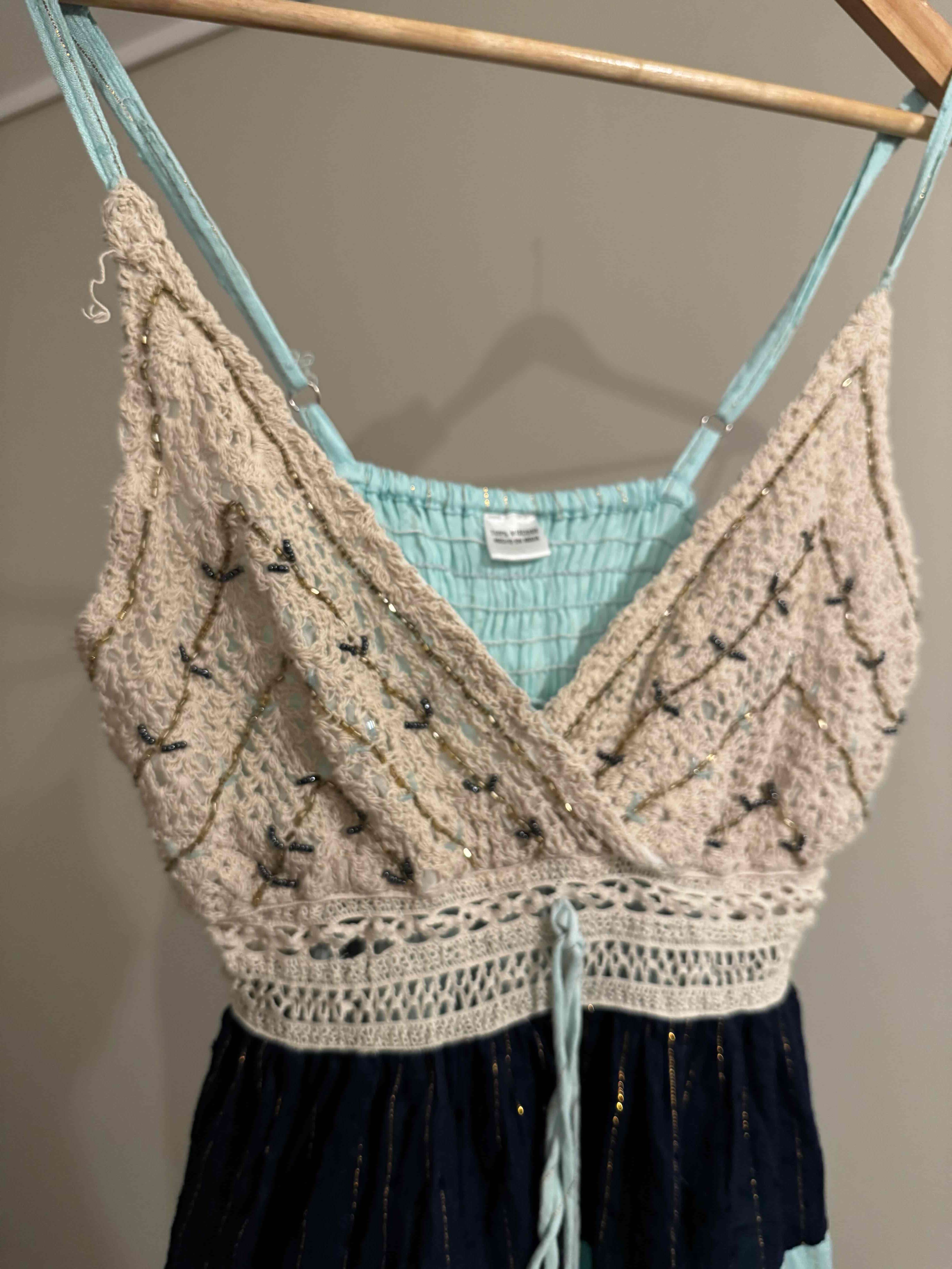 Vestido estilo bohemio con detalle de crochet y bordados brillantes. Ideal para ocasiones especiales. Estado bueno con mínimos signos de uso.