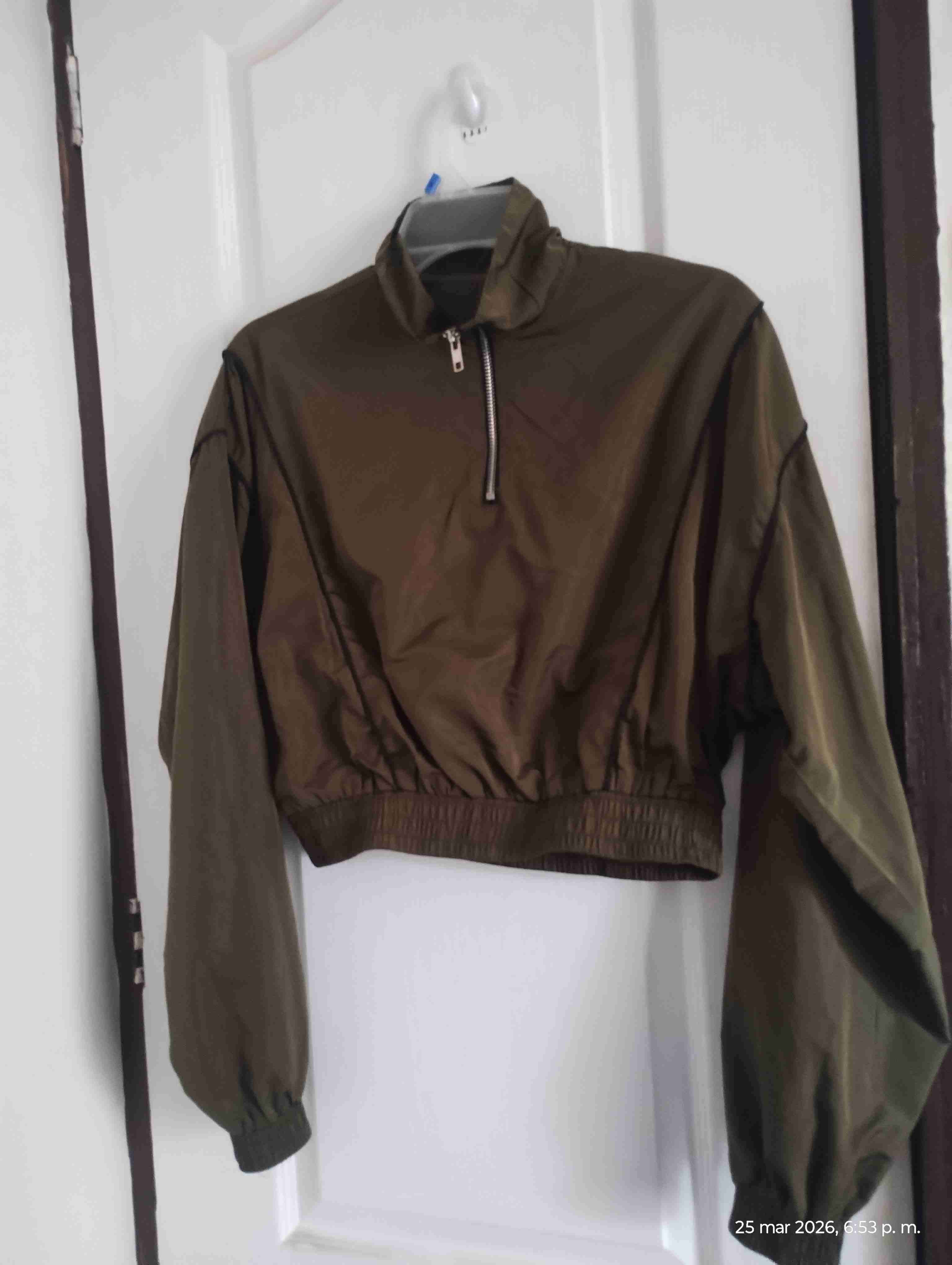 Cortavientos en tono verde oliva con cierre frontal. Perfecto para días frescos y casuales.