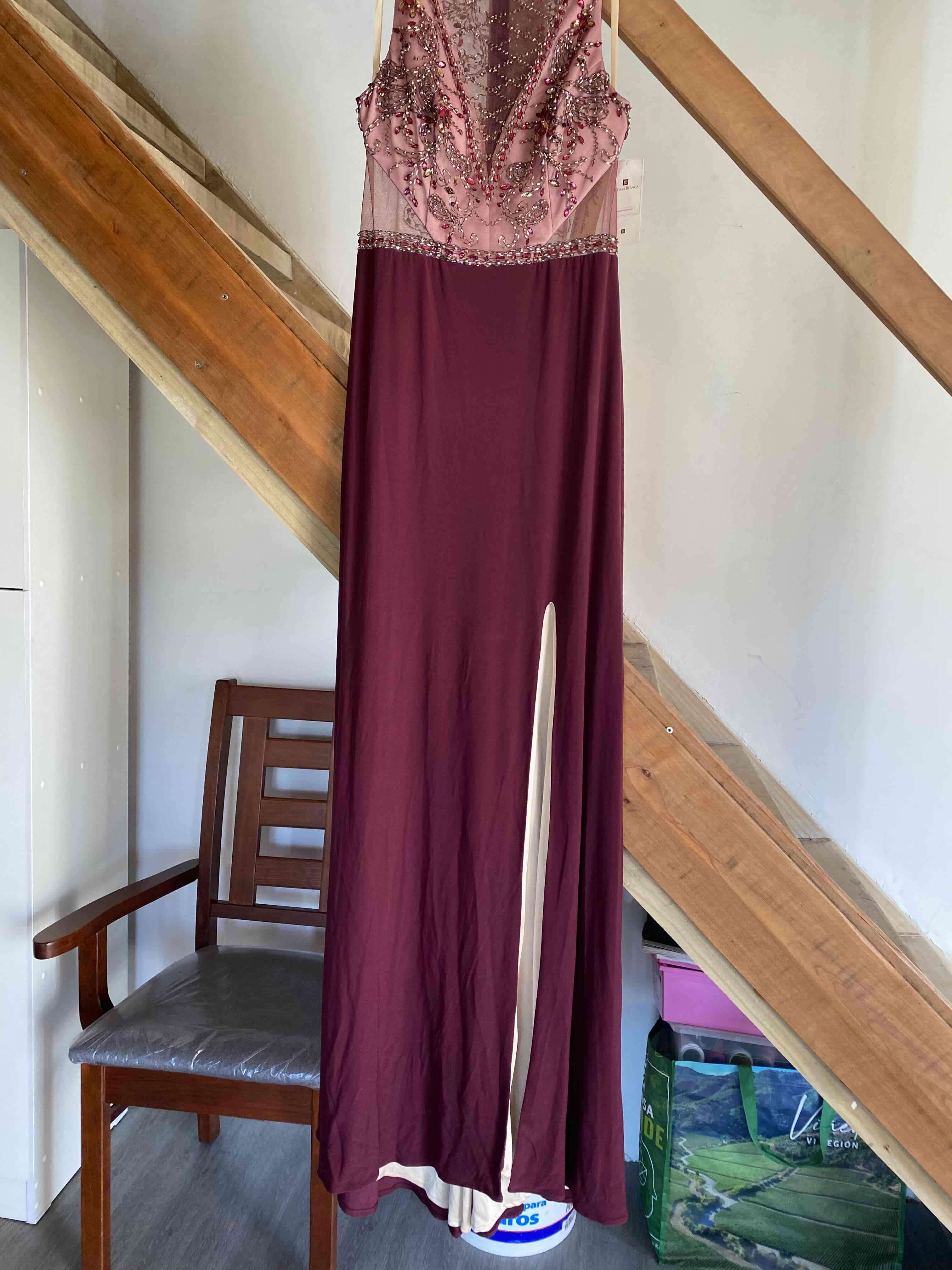 Vestido largo burdeos con detalles bordados y transparencias. Ideal para eventos formales, en buen estado.