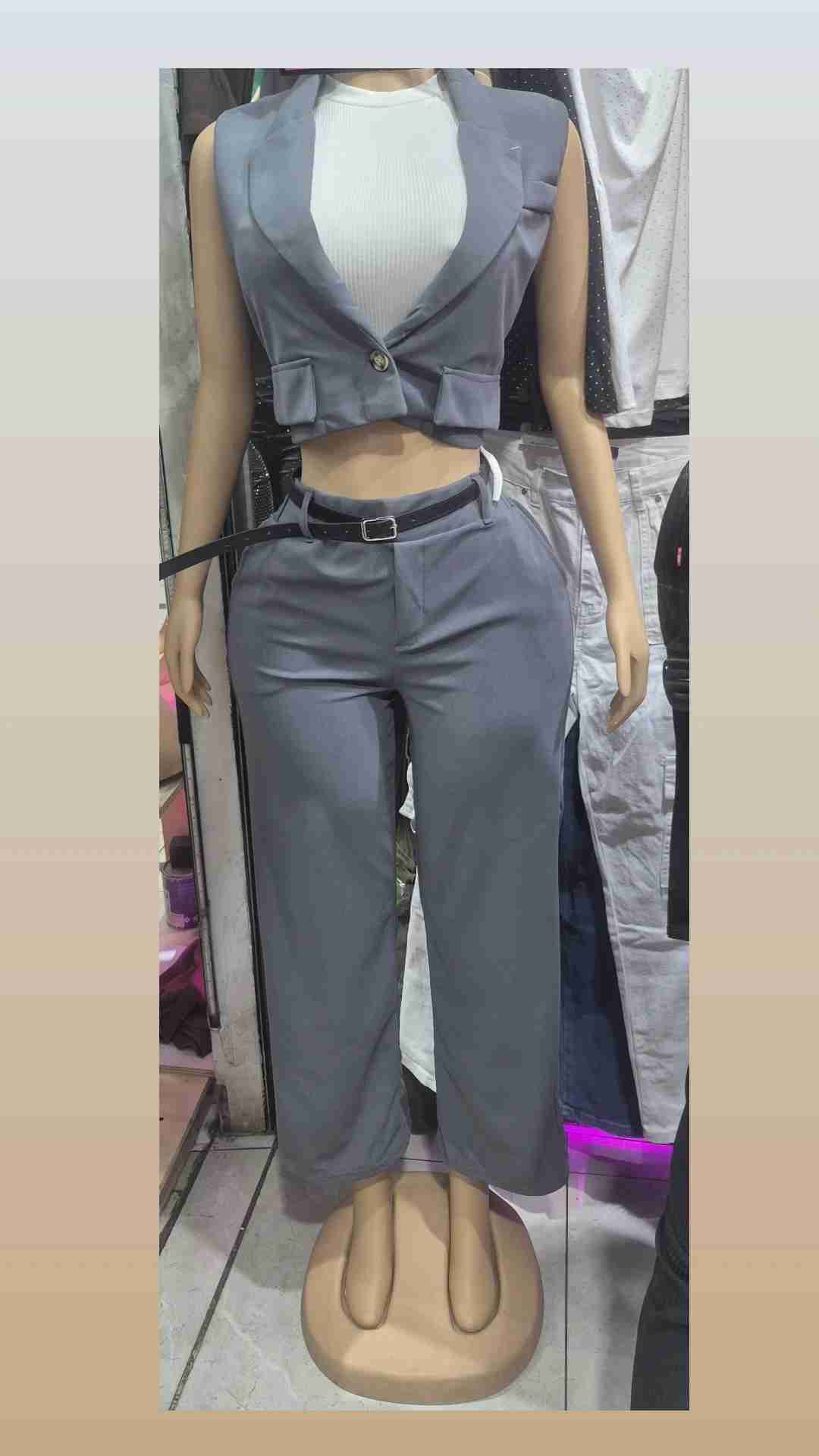 Conjunto elegante gris sin mangas, ideal para oficina o eventos formales. En buen estado, con cortes modernos.