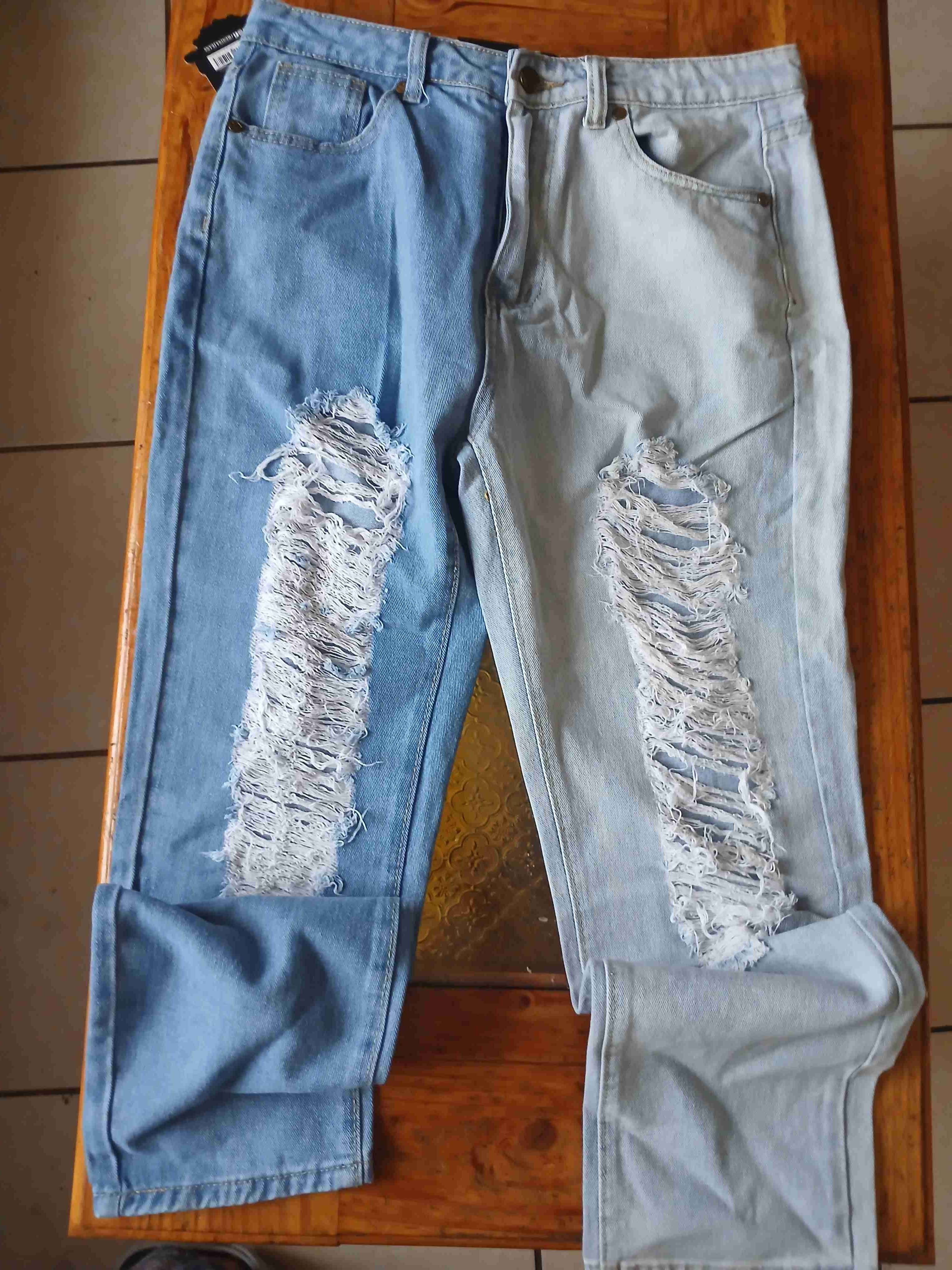 Jeans de mezclilla azules y celestes con diseño desgastado. Estilo moderno y juvenil, nuevo, menina