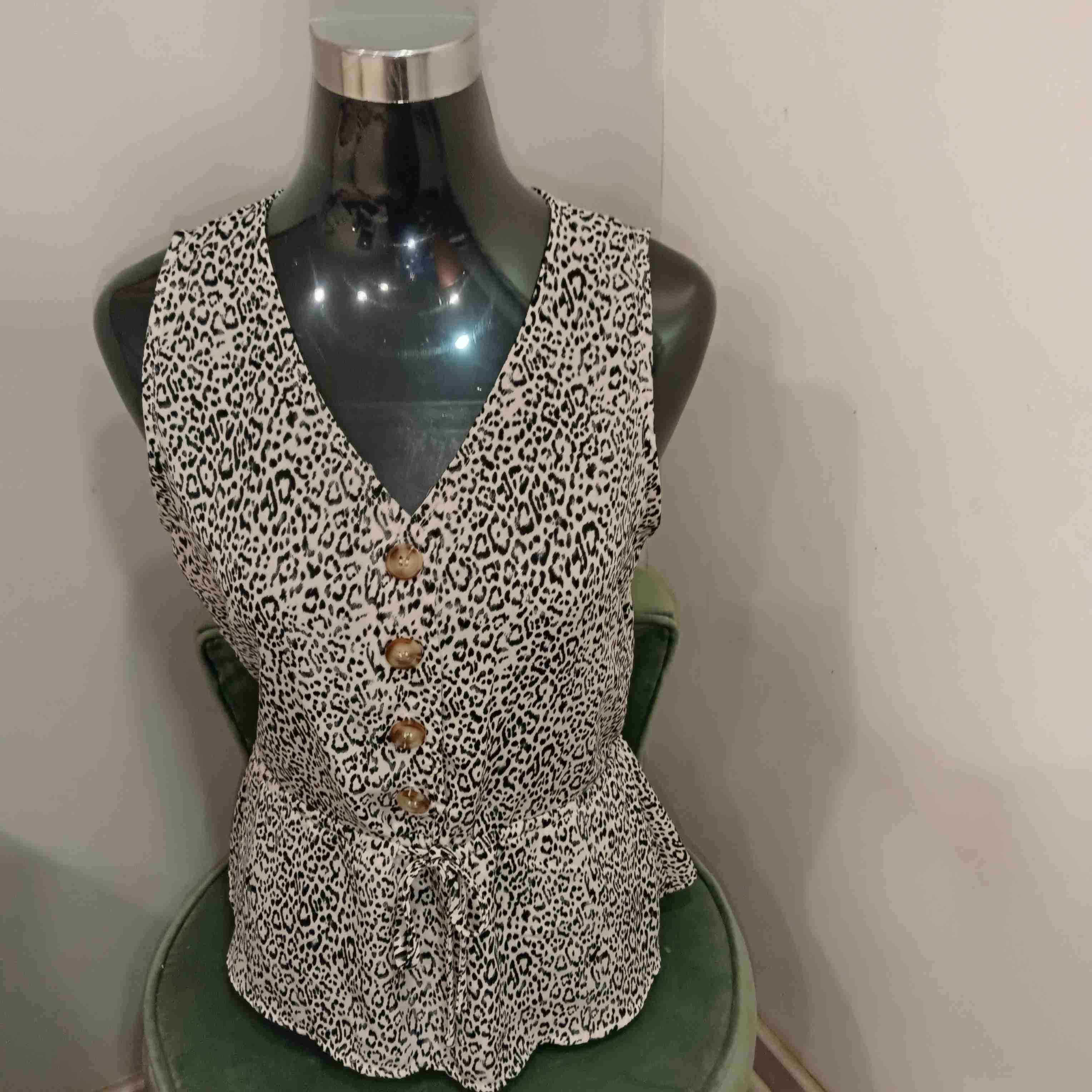 Blusa sin mangas con diseño animal print y botones delanteros. Queda linda para ir a trabajar con Pantalón y blazer negro. También queda perfecta con un Palazzo blanco.