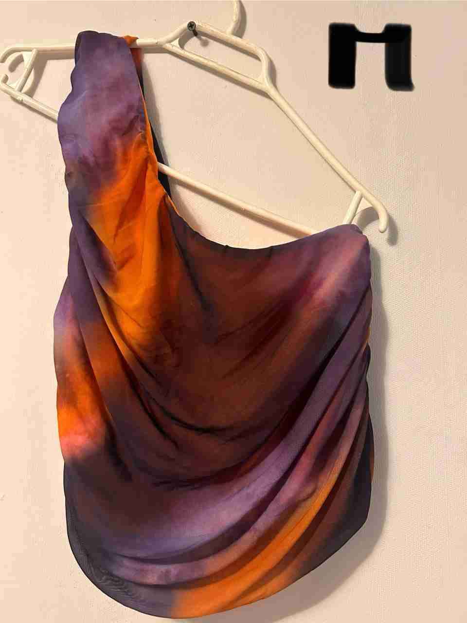 Blusa con diseño asimétrico en tonos naranjas y morados. Tiene forro, talla M