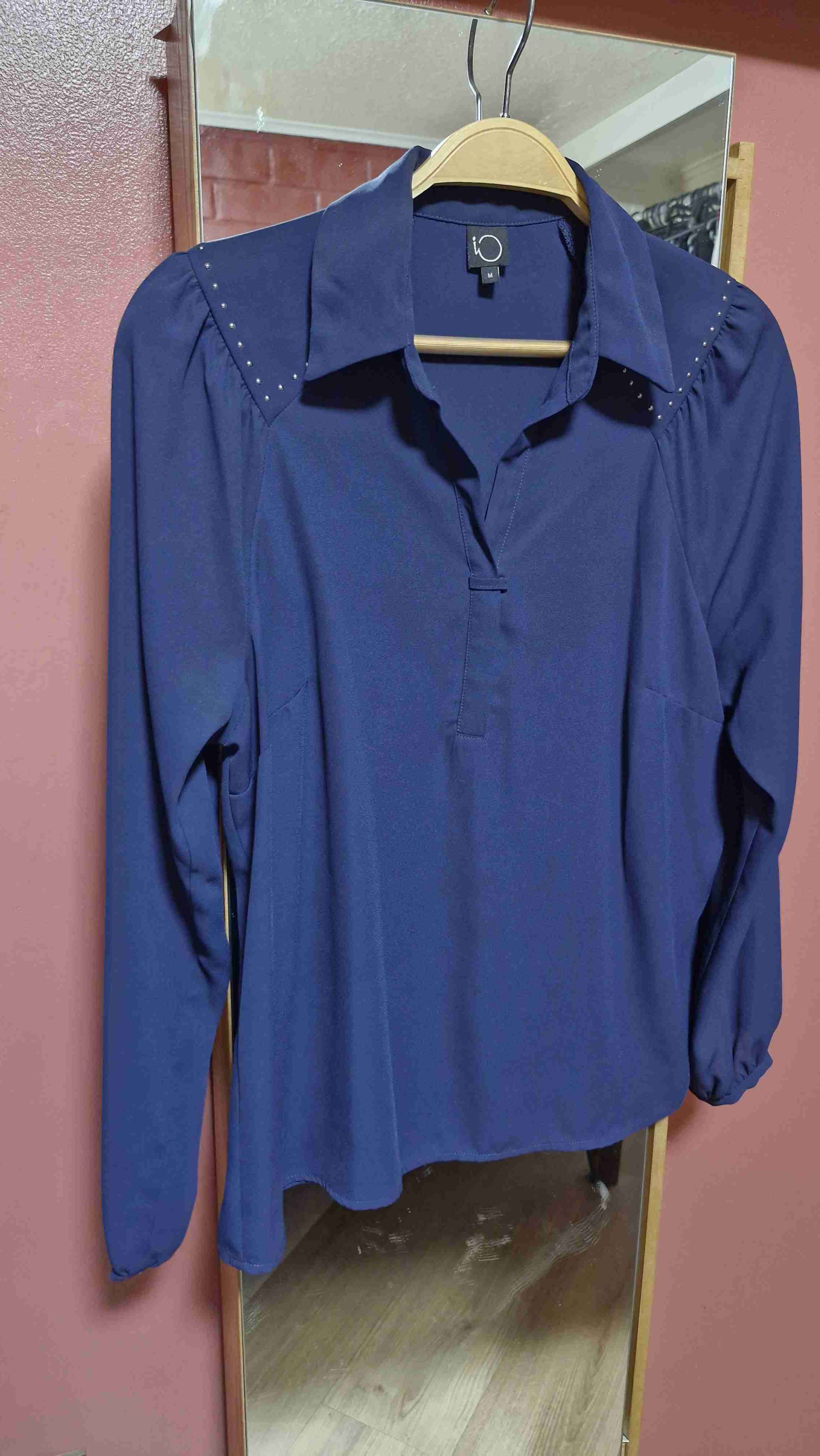 Blusa de mujer en color azul oscuro con apliques en los hombros. Ideal para ocasiones formales o casuales. En buen estado.