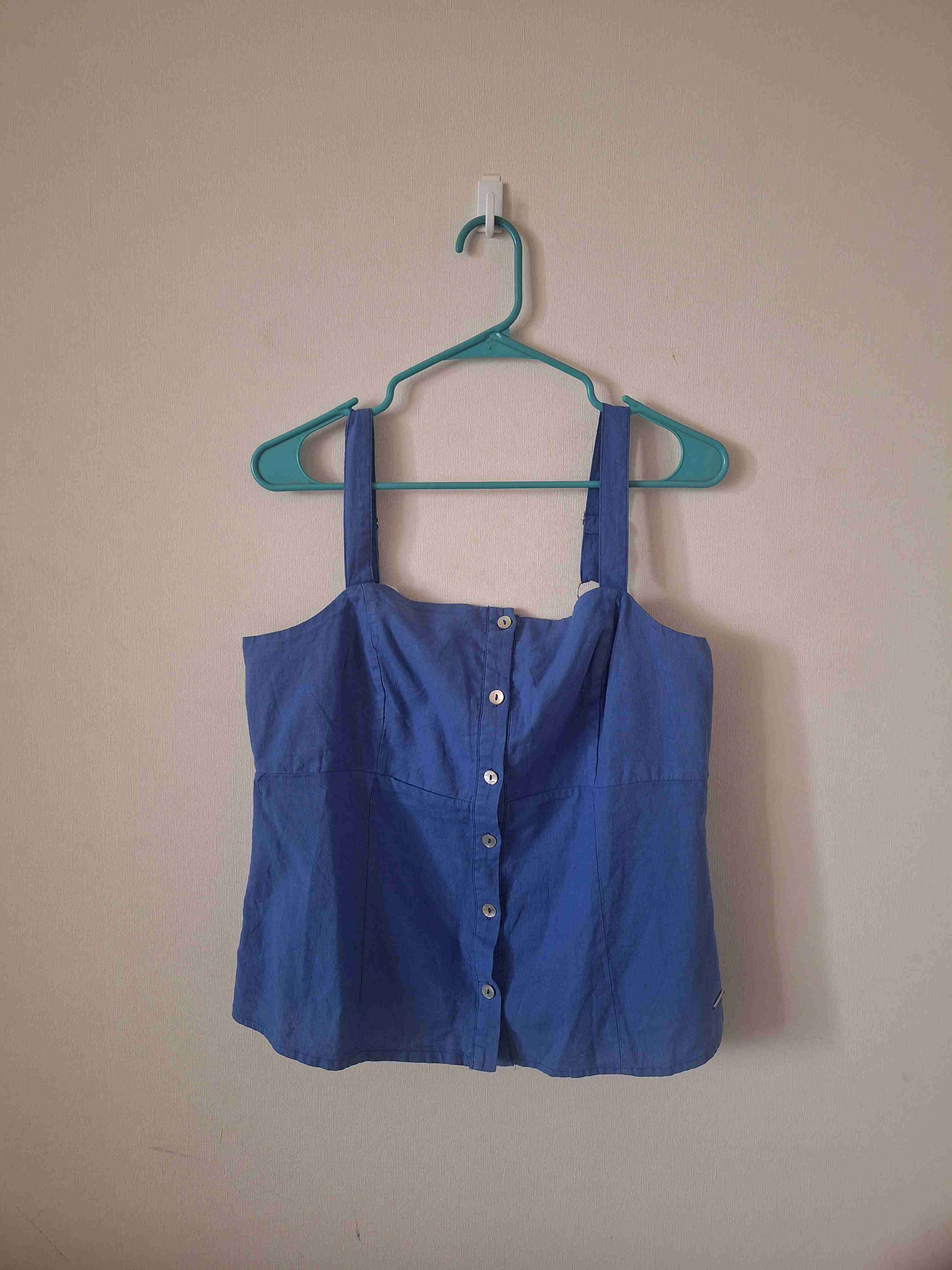 Blusa azul con tirantes y botones, estilo casual. En buen estado y lista para usar en días cálidos.