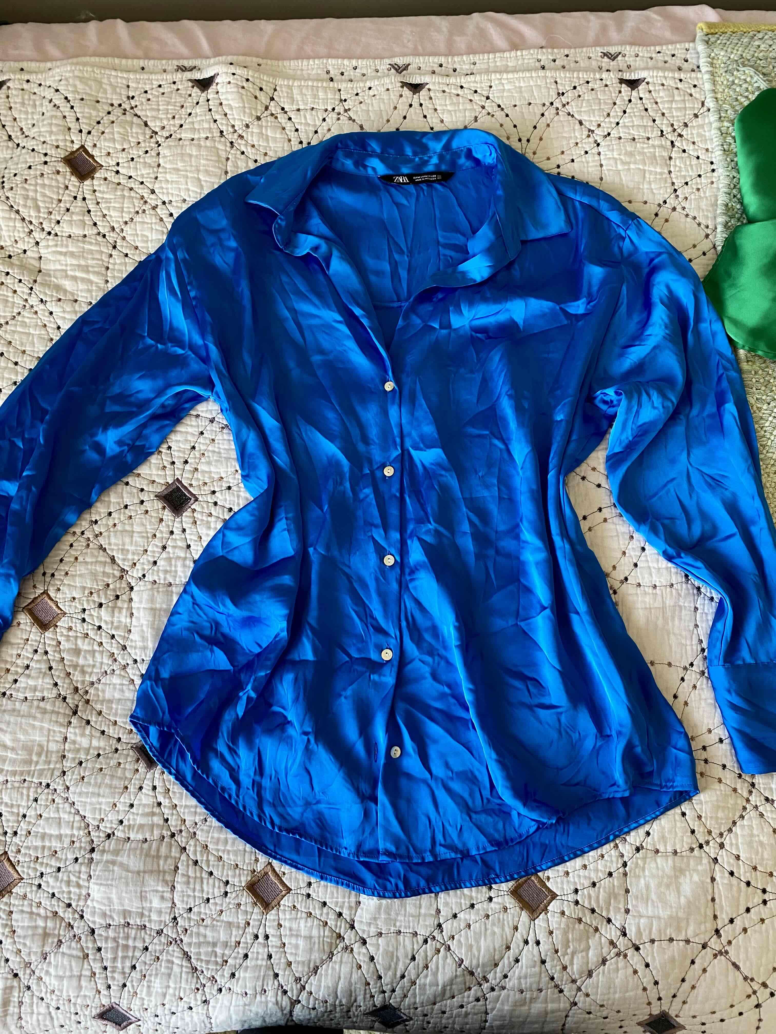Elegante blusa azul satinada de manga larga, perfecta para ocasiones formales. Se encuentra en buen estado general.