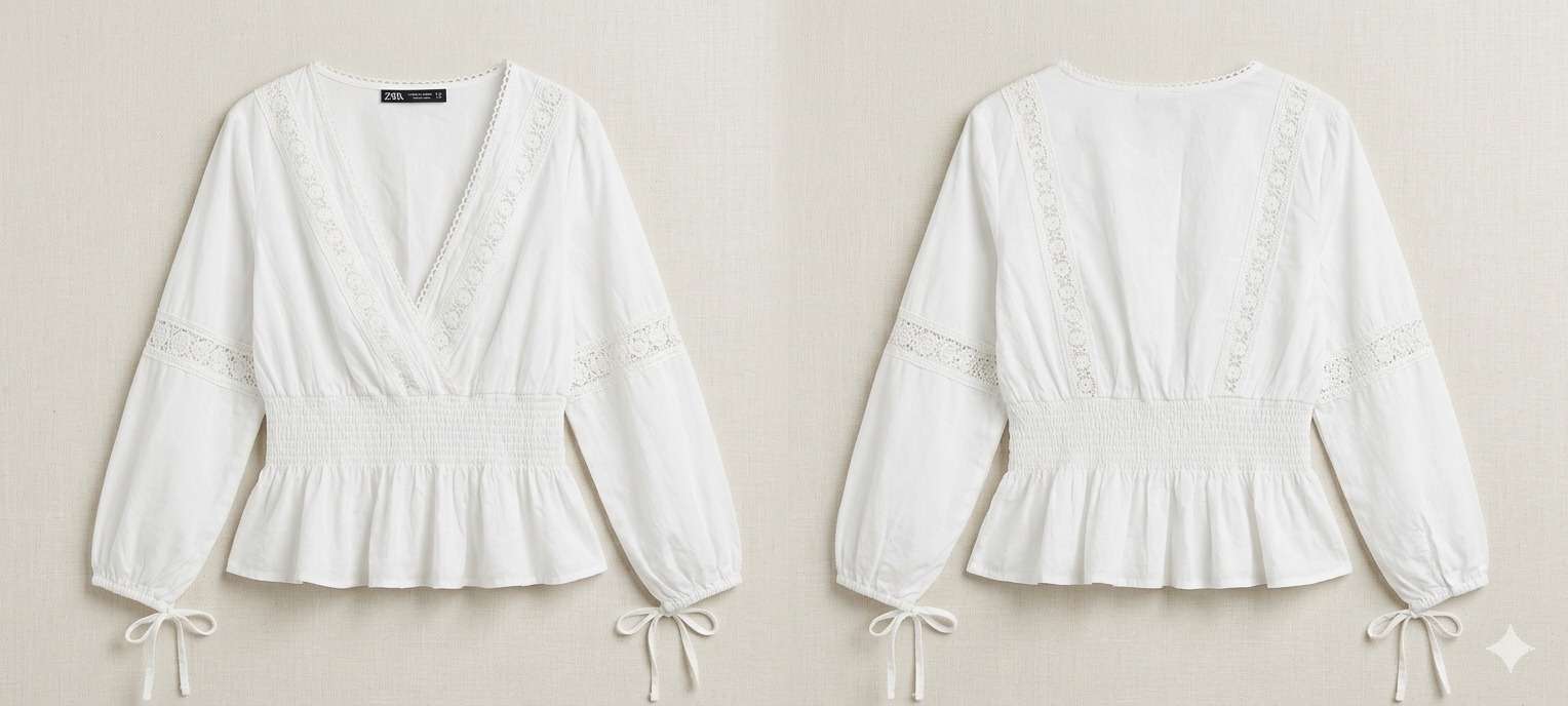 Blusa blanca de manga larga con detalles de encaje. Ideal para un look casual y femenino.