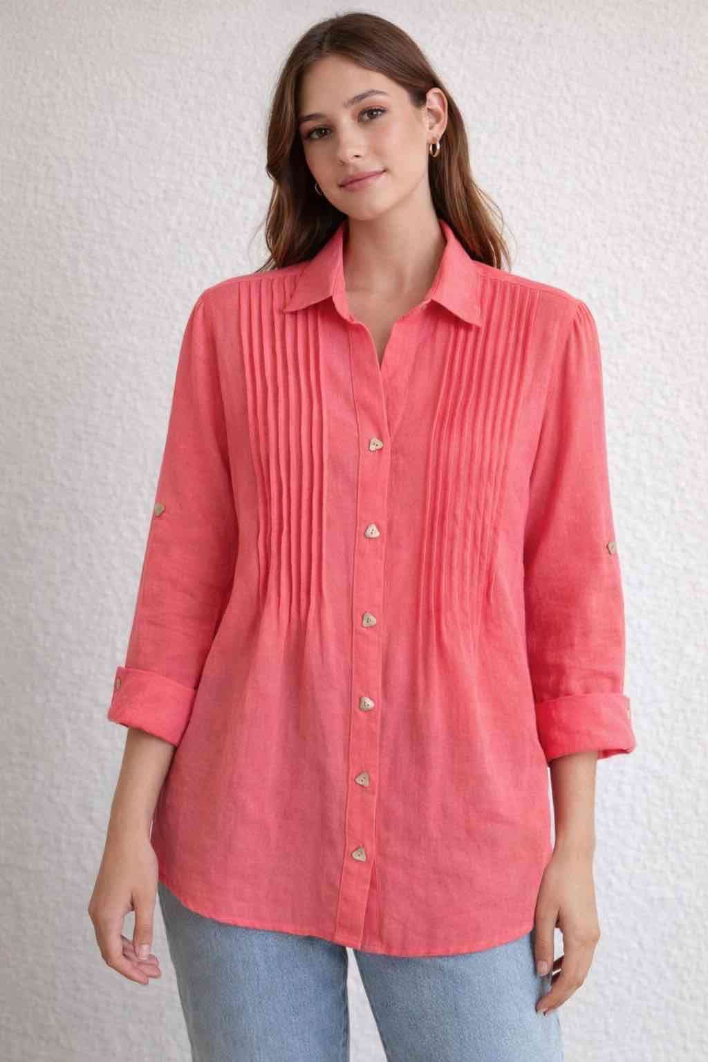 Blusa de mujer en color coral con pliegues frontales y mangas largas, de lino. Ideal para un look casual. Es un L holgado.