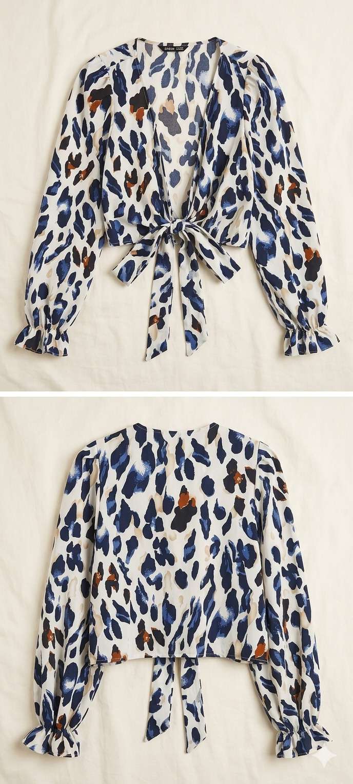 Blusa elegante con diseño de animal print en tonos azules y marrones, buen estado. Ideal para usar en ocasiones especiales o salidas casuales.