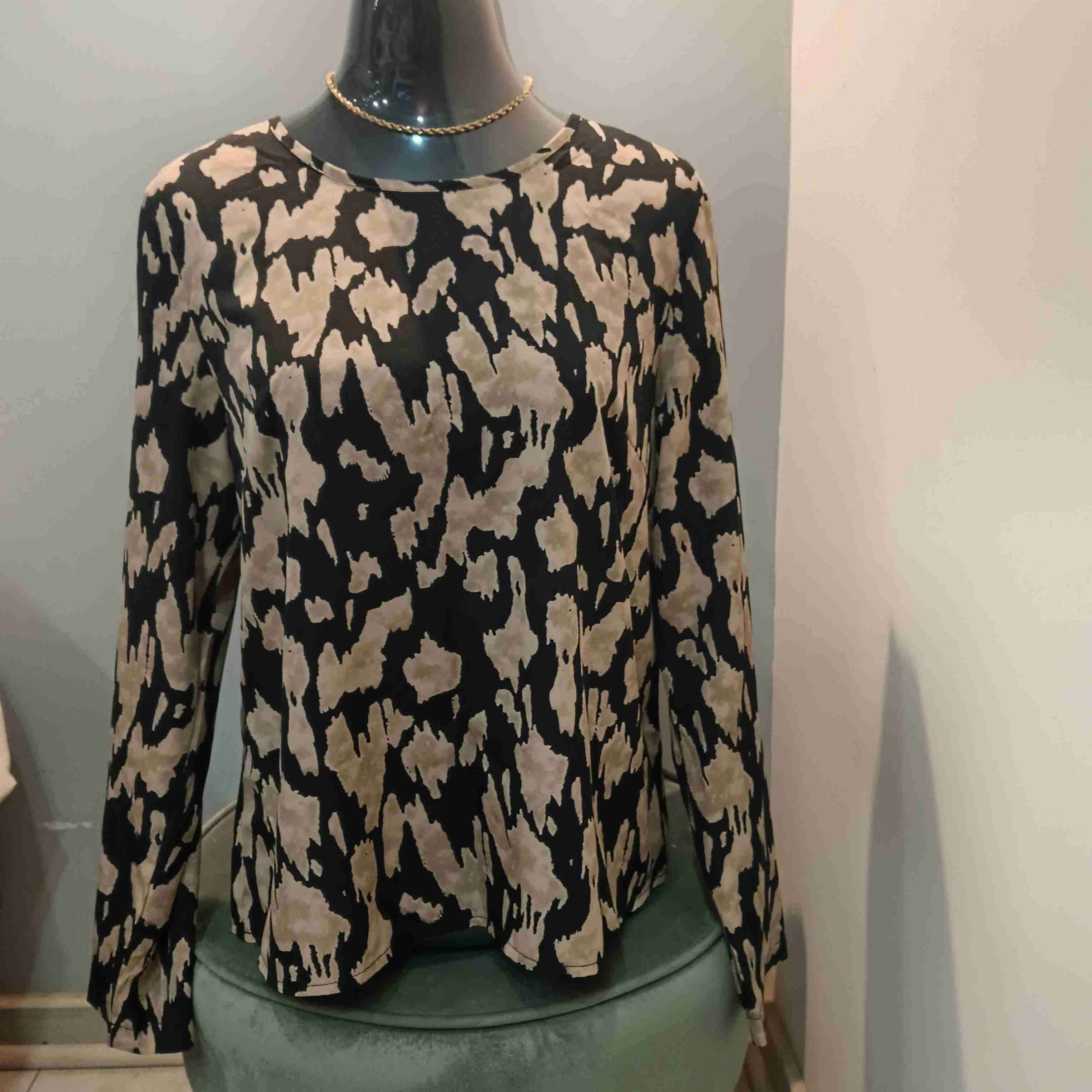 Talla M, blusa de manga larga con estampado moderno en beige y negro. Escote delicado en la espalda. Ideal para ocasiones casuales. Cuidada con ❤️