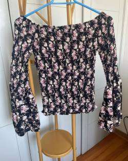 Blusa Barbados, elasticada tipo panal, manga acampanada, cuello bote y elasticado, para ser usada con hombros descubiertos, estampado pequeñas flores, talla S, suavecita. POCO USO, EXCELENTE ESTADO