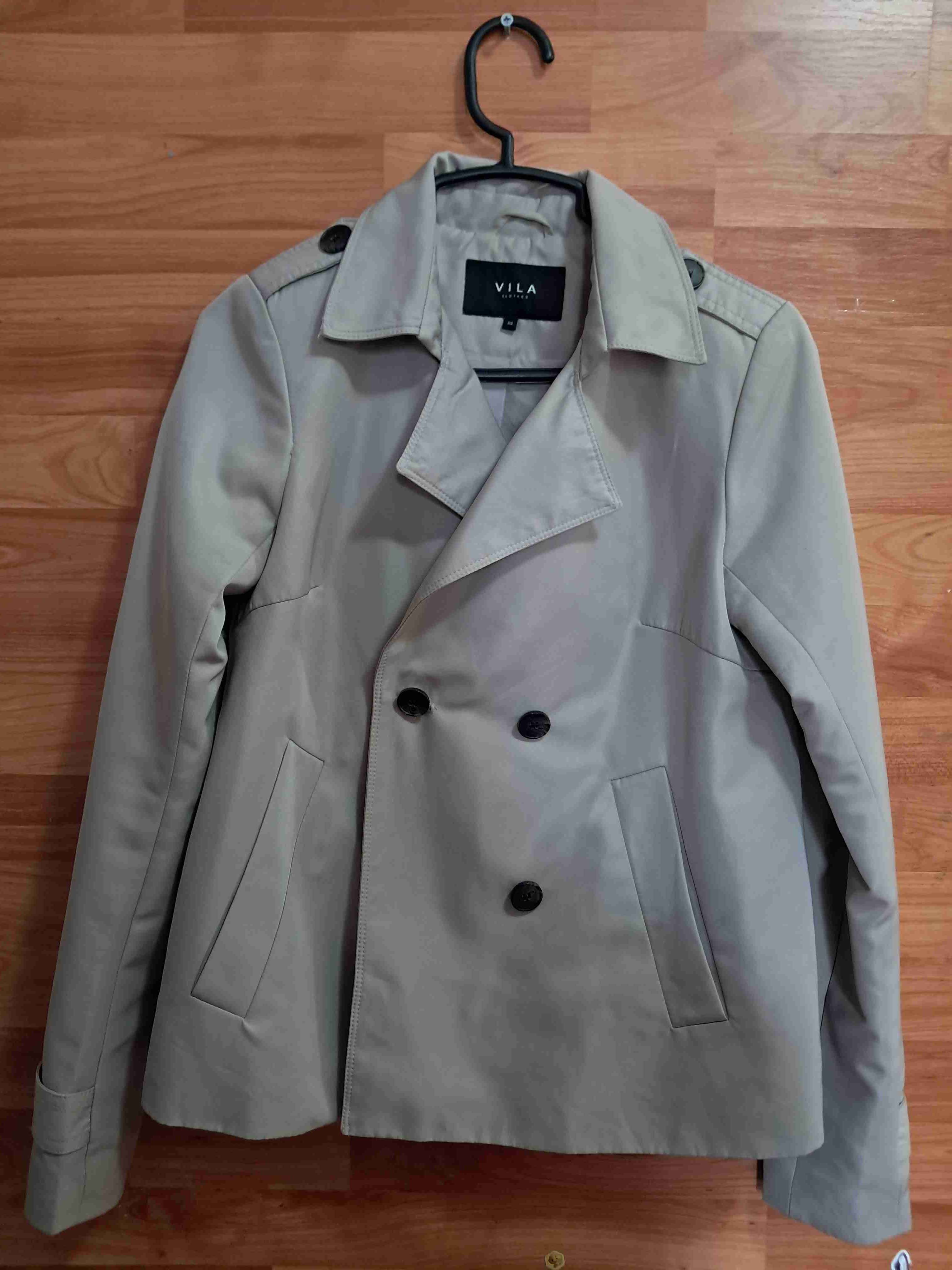 Elegante abrigo beige de la marca Vila, ideal para el invierno. En buen estado general, perfecto para ocasiones formales.