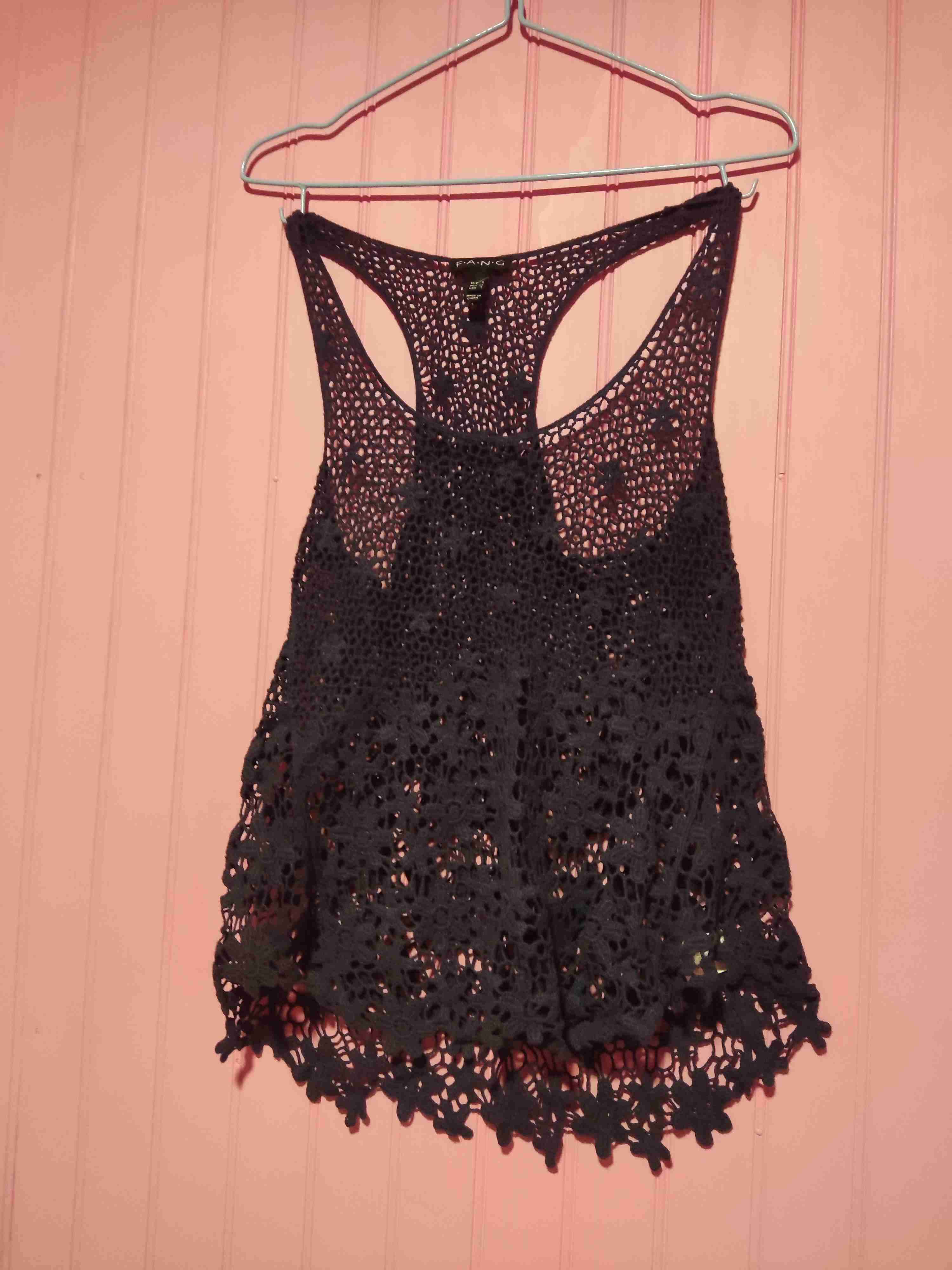 Polera sin mangas calada negra, ideal para el verano. En buen estado, con diseño floral.
