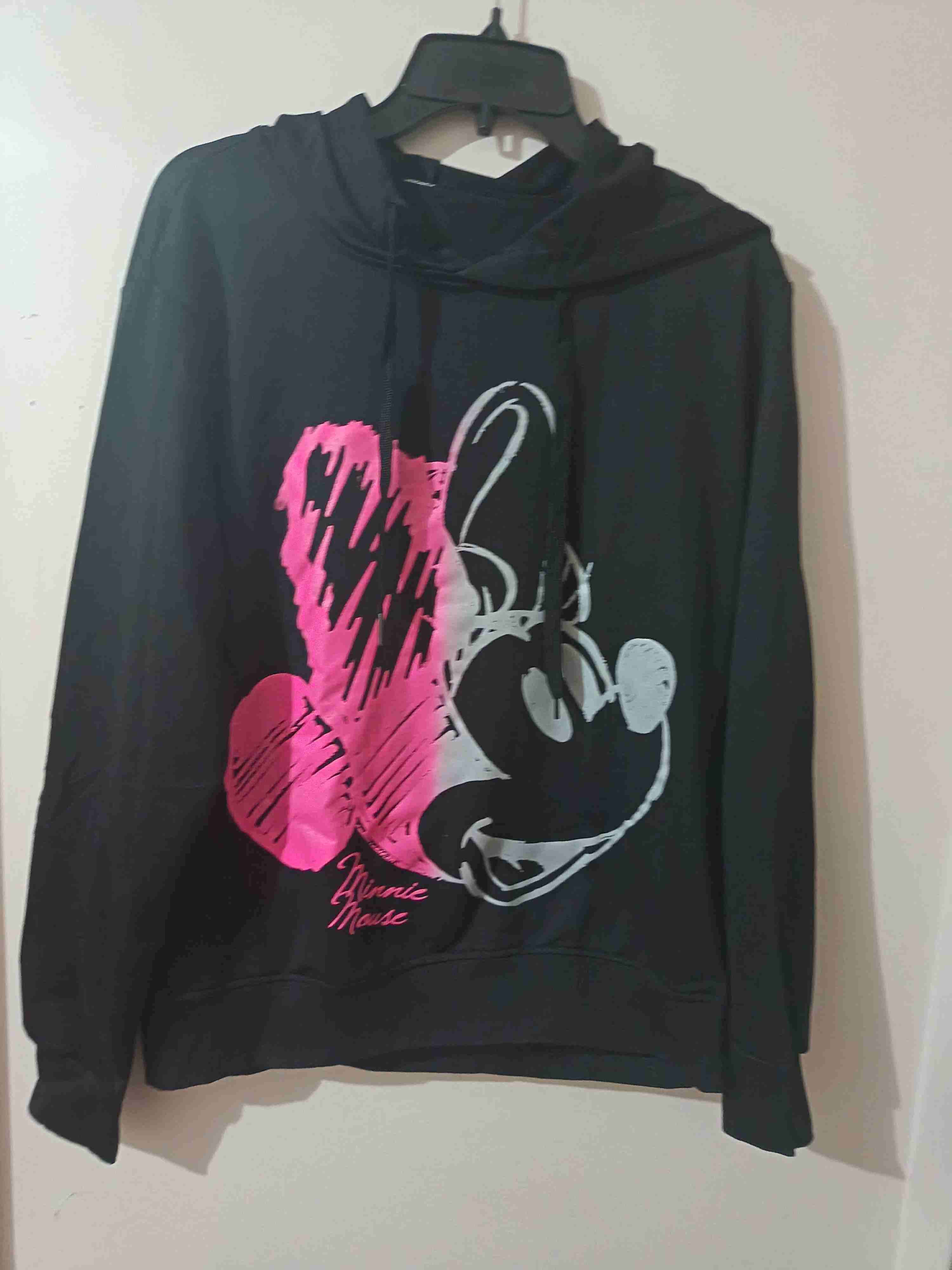 Polerón negro con capucha y diseño de Minnie Mouse en colores vivos. Ideal para días frescos. Talla, s/m