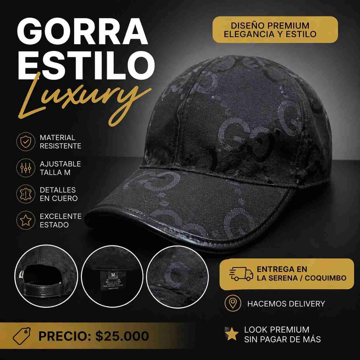 Gorra negra con detalles en cuero y material resistente. Ajustable, talla M, en excelente estado.