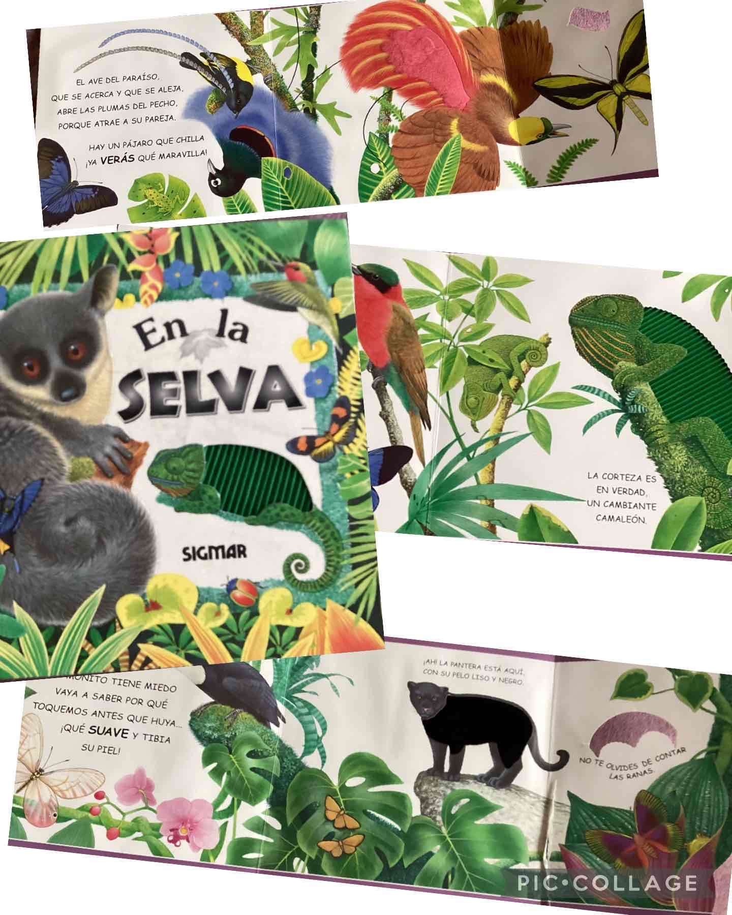 Libro infantil con hermosas ilustraciones de animales de la selva. Ideal para niños curiosos y amantes de la naturaleza. Interactivo con imágenes en relieve y textura. Tapa y hojas carton