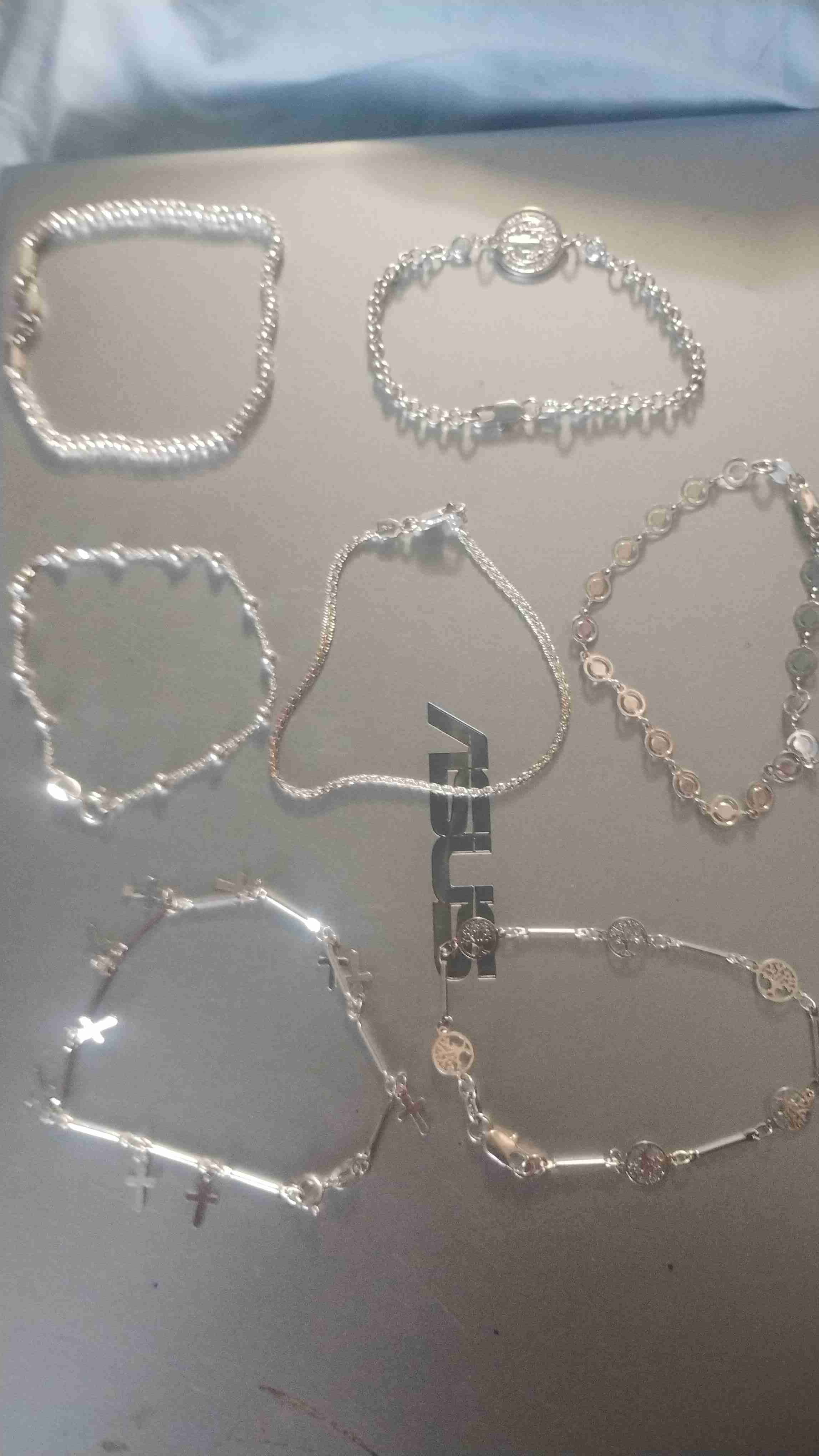Elegante conjunto de pulseras de plata, excelente estado y con detalles religiosos. Perfectas para toda ocasión.