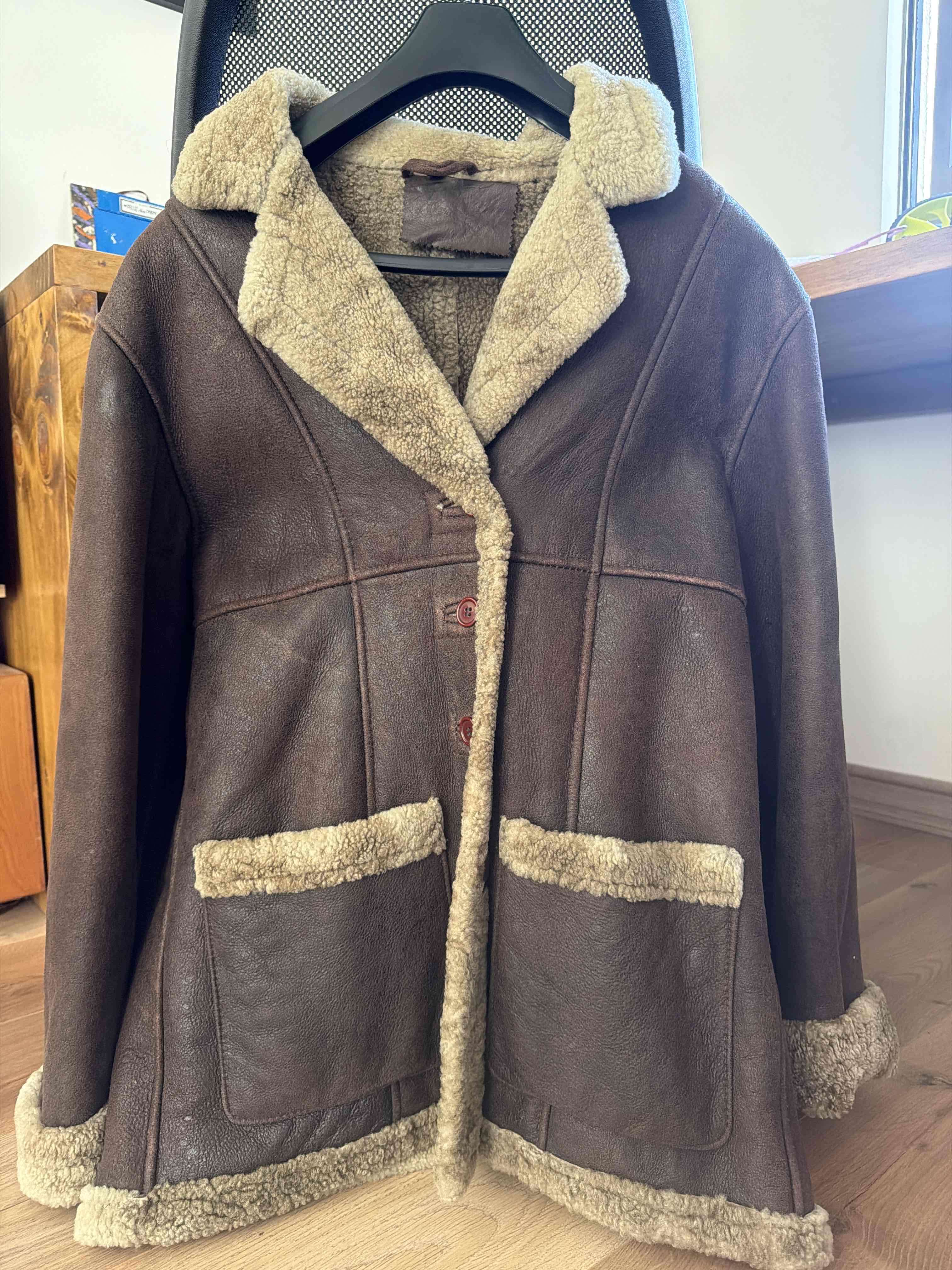 Abrigo de cuero marrón con forro de lana, ideal para el invierno. En buen estado, con leves signos de uso.