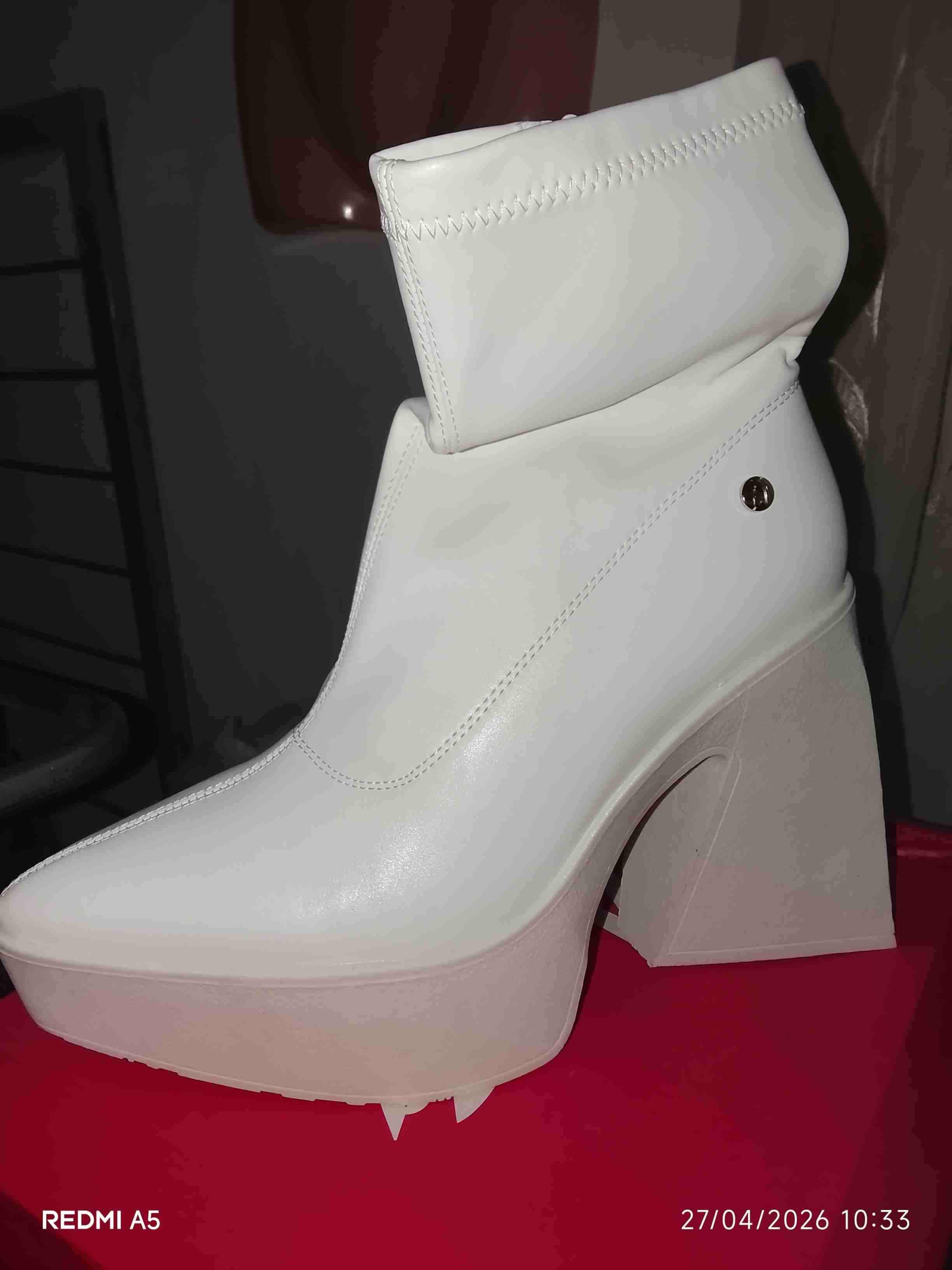 Elegante botín blanco con plataforma y tacón alto. Ideal para eventos y uso diario. Buen estado general con detalles mínimos.