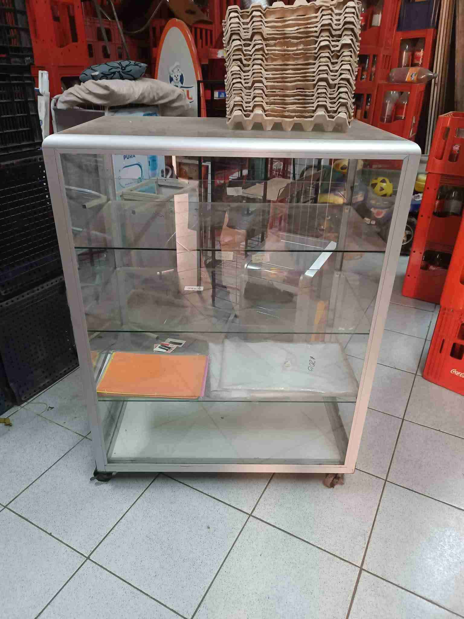 Vitrina de exhibición con estantes de vidrio y ruedas. Ideal para tiendas o ferias. Buen estado general.