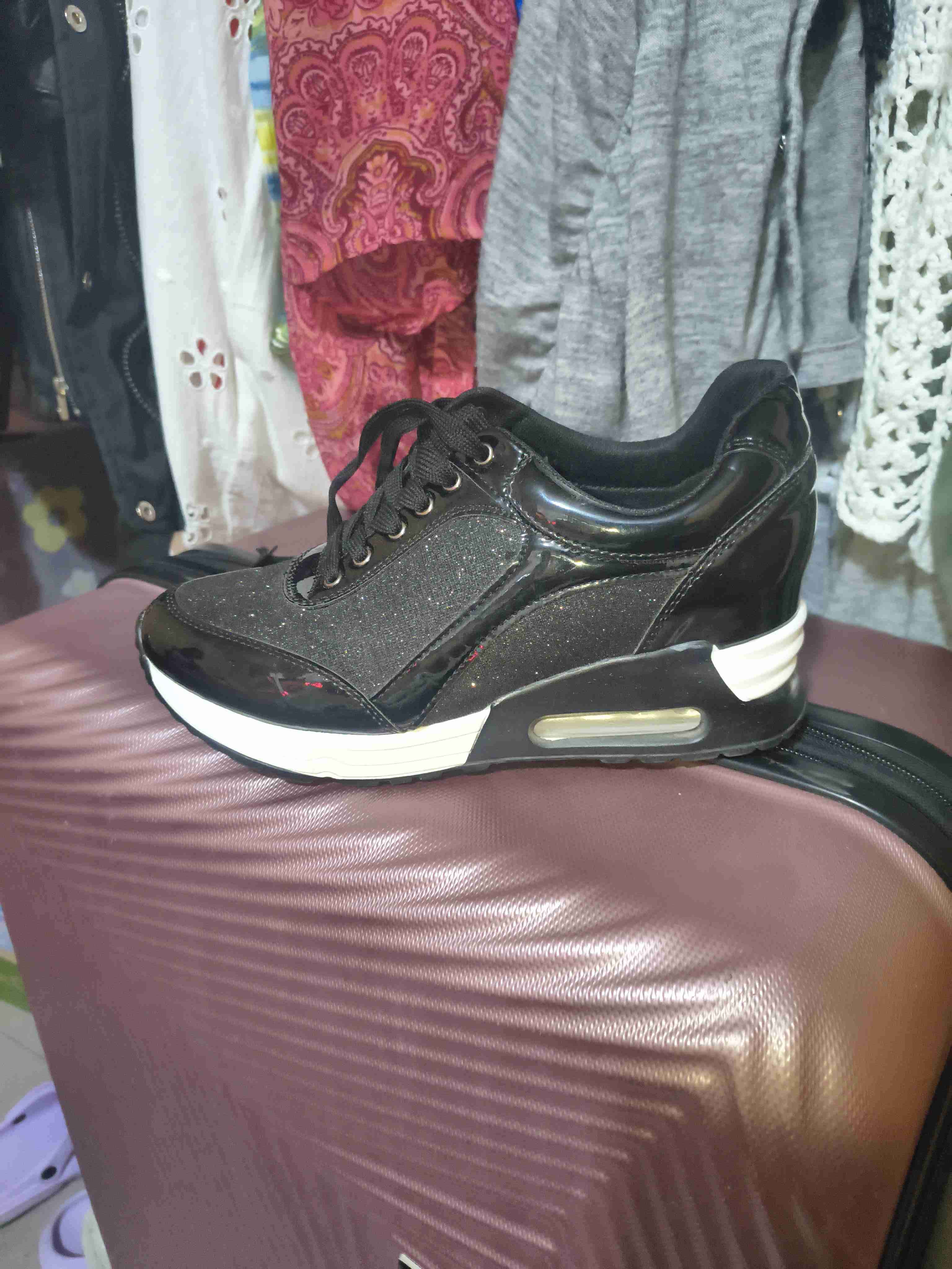 Zapatillas deportivas negras con detalles brillantes. En buen estado, ideal para uso casual o deportivo.