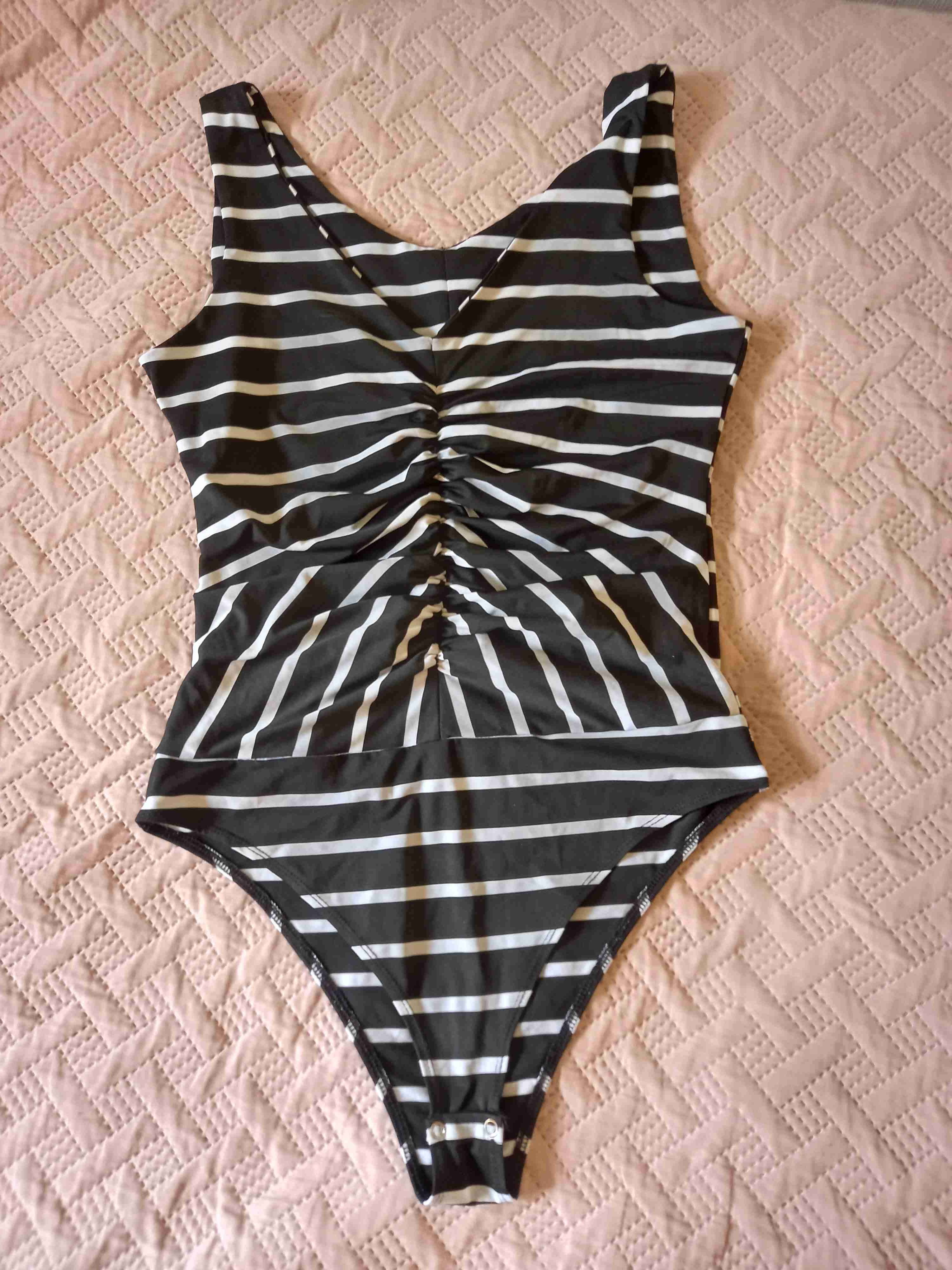 Bodie entero con diseño de rayas en blanco y negro. En buen estado, muy elasticado y cómodo, talla M. Tiene broches en la parte inferior. Es doble tela.