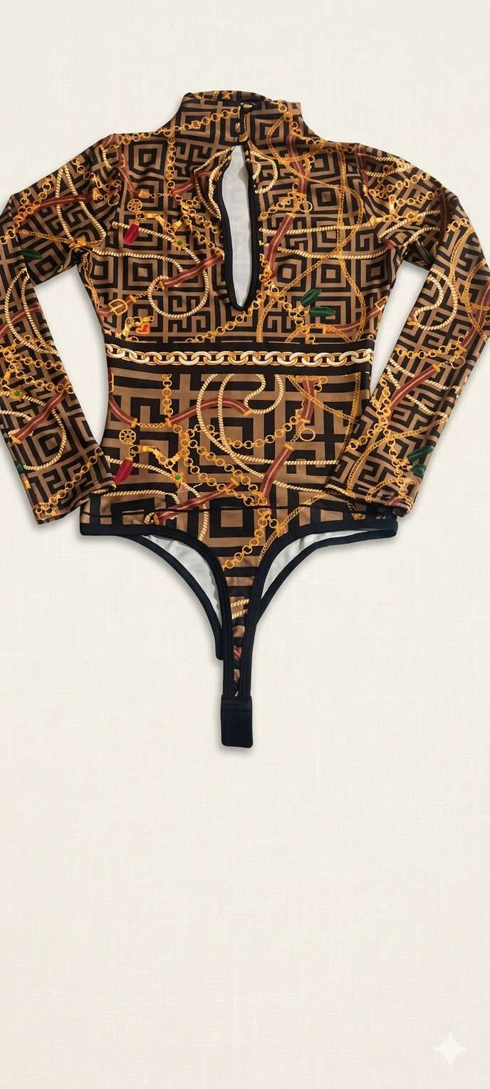 Body de manga larga con elegante estampado de cadenas, ideal para ocasiones especiales. En buen estado, con ligeros signos de uso.