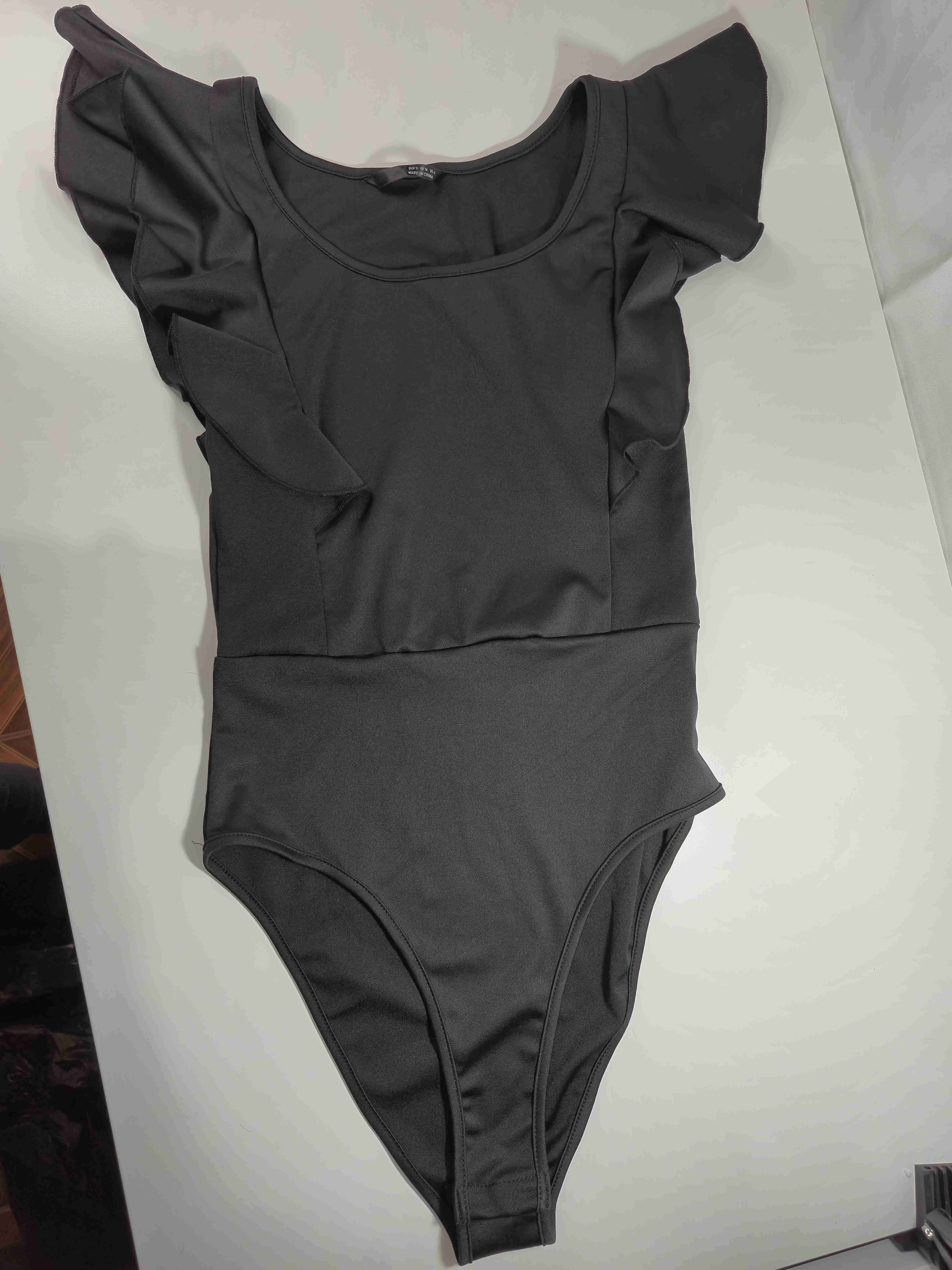 Elegante body negro con detalles de volantes en los hombros, para ocasiones especiales o casuales. Talla S