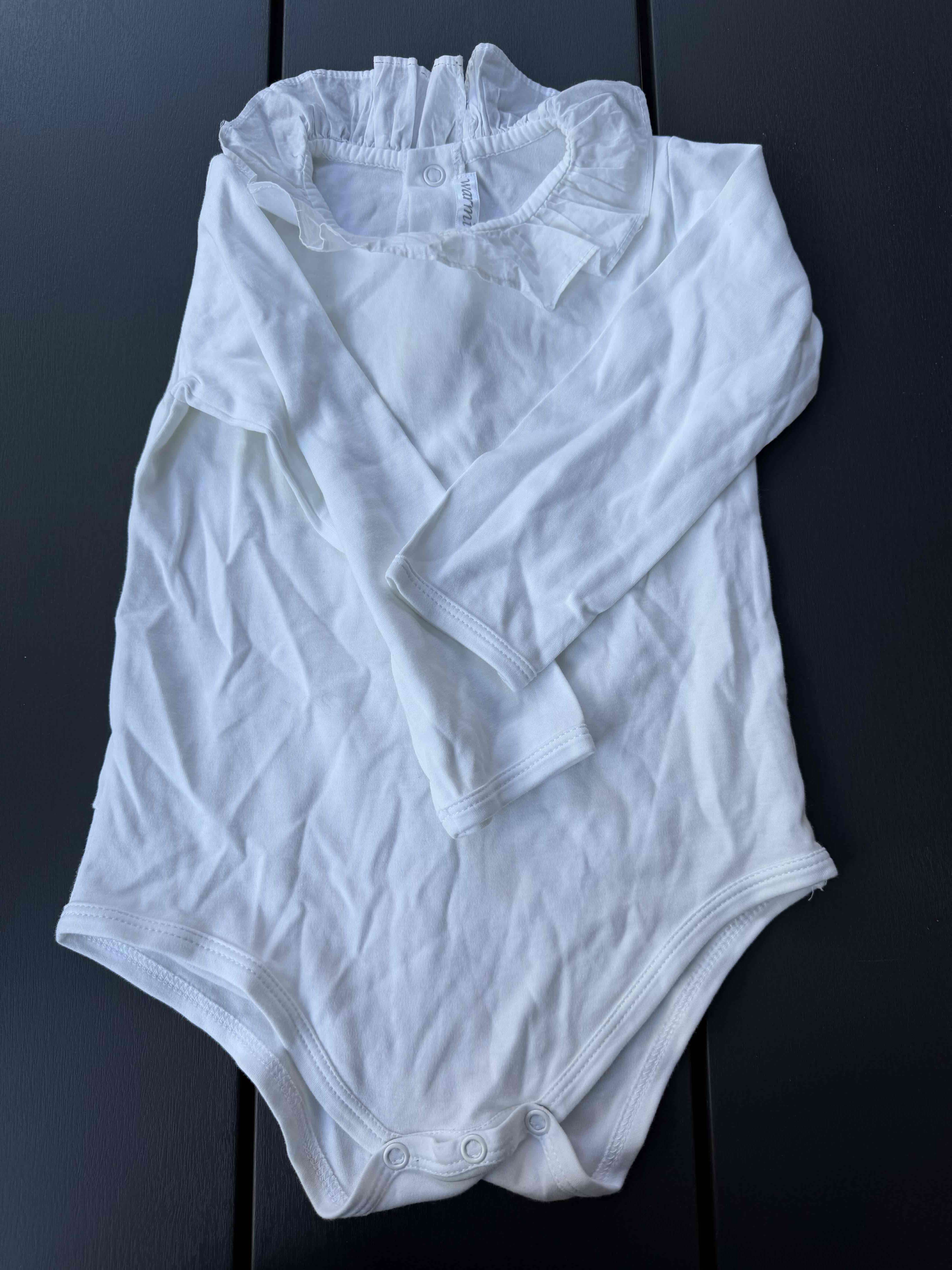 Body blanco para bebé marca Warmi, manga larga y cuello con volantes. Ideal para combinar en cualquier ocasión, en buen estado. Talla 2.