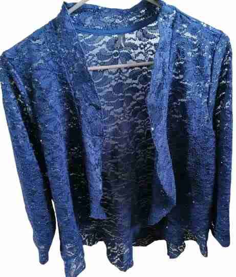 Chaqueta azul de encaje ideal para ocasiones elegantes. En buen estado, ligera y con diseño abierto.Talla L
