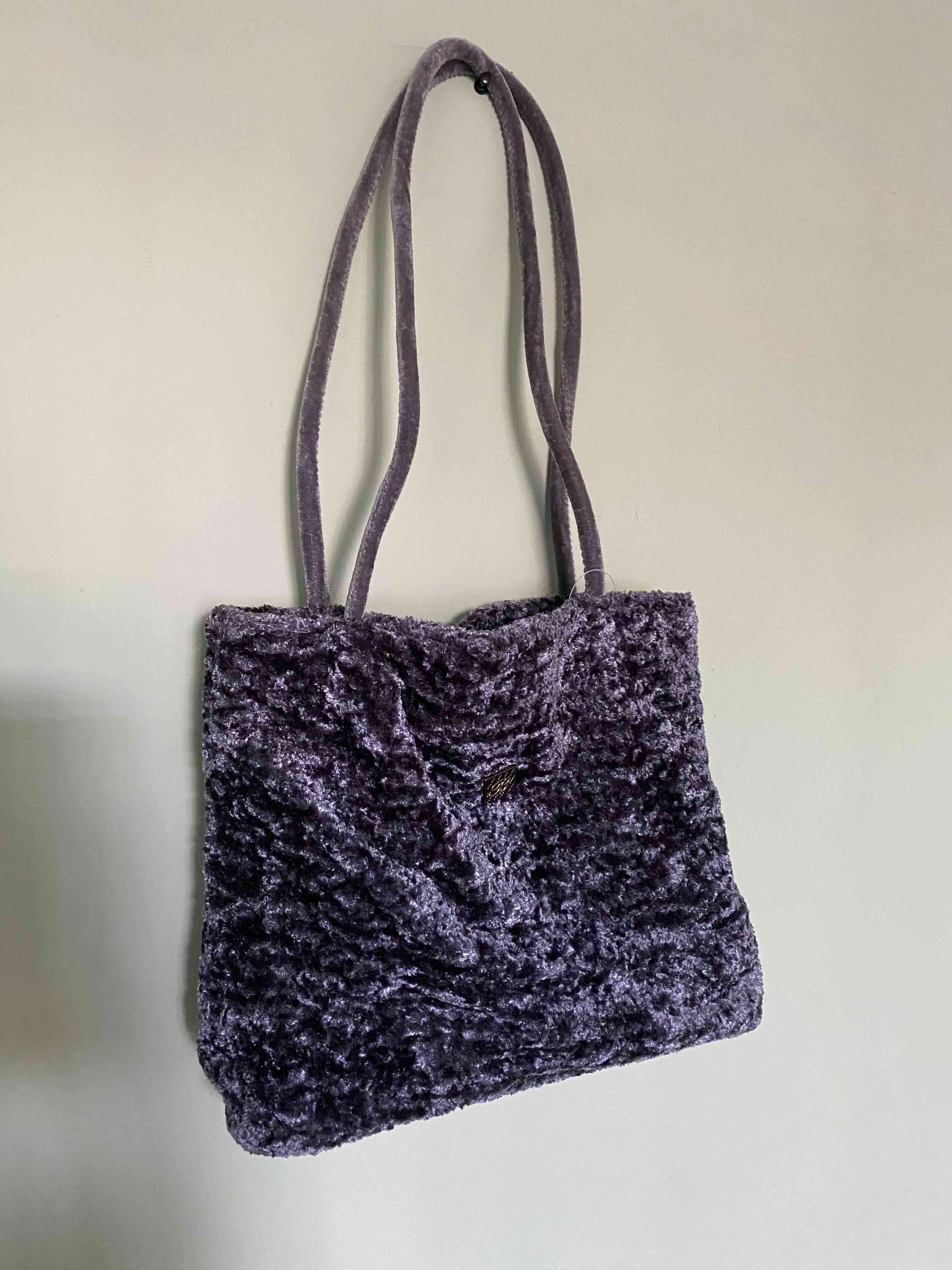 Bolso de felpa gris azulado con asas largas, ideal para uso diario. En buen estado.