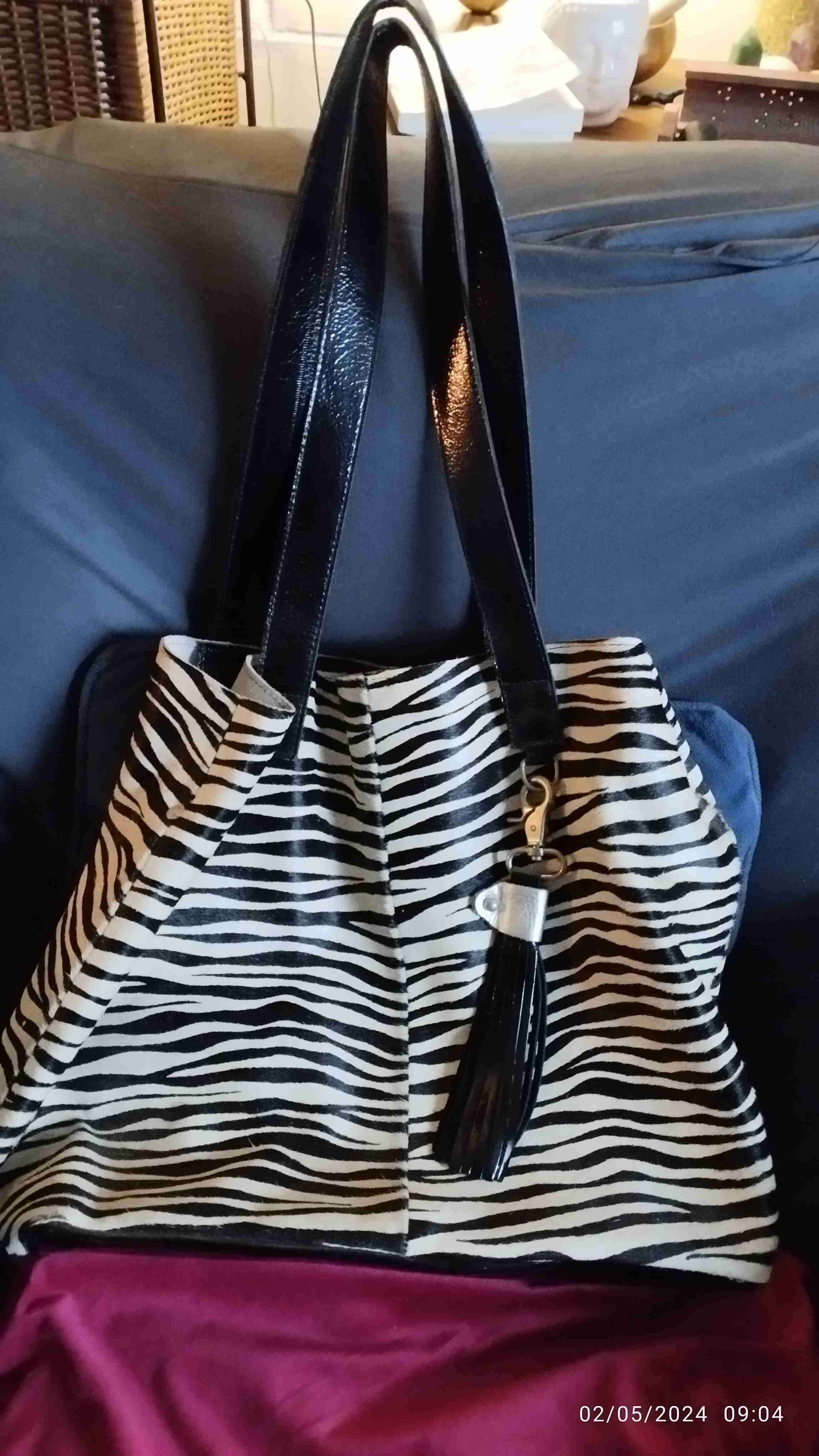 Elegante bolso de mano en buen estado,casi nada de uso, ideal para uso diario o salidas casuales. Diseño con estampado de cebra y detalles en negro, 100% cuero legítimo, valor en el mercado $85.000