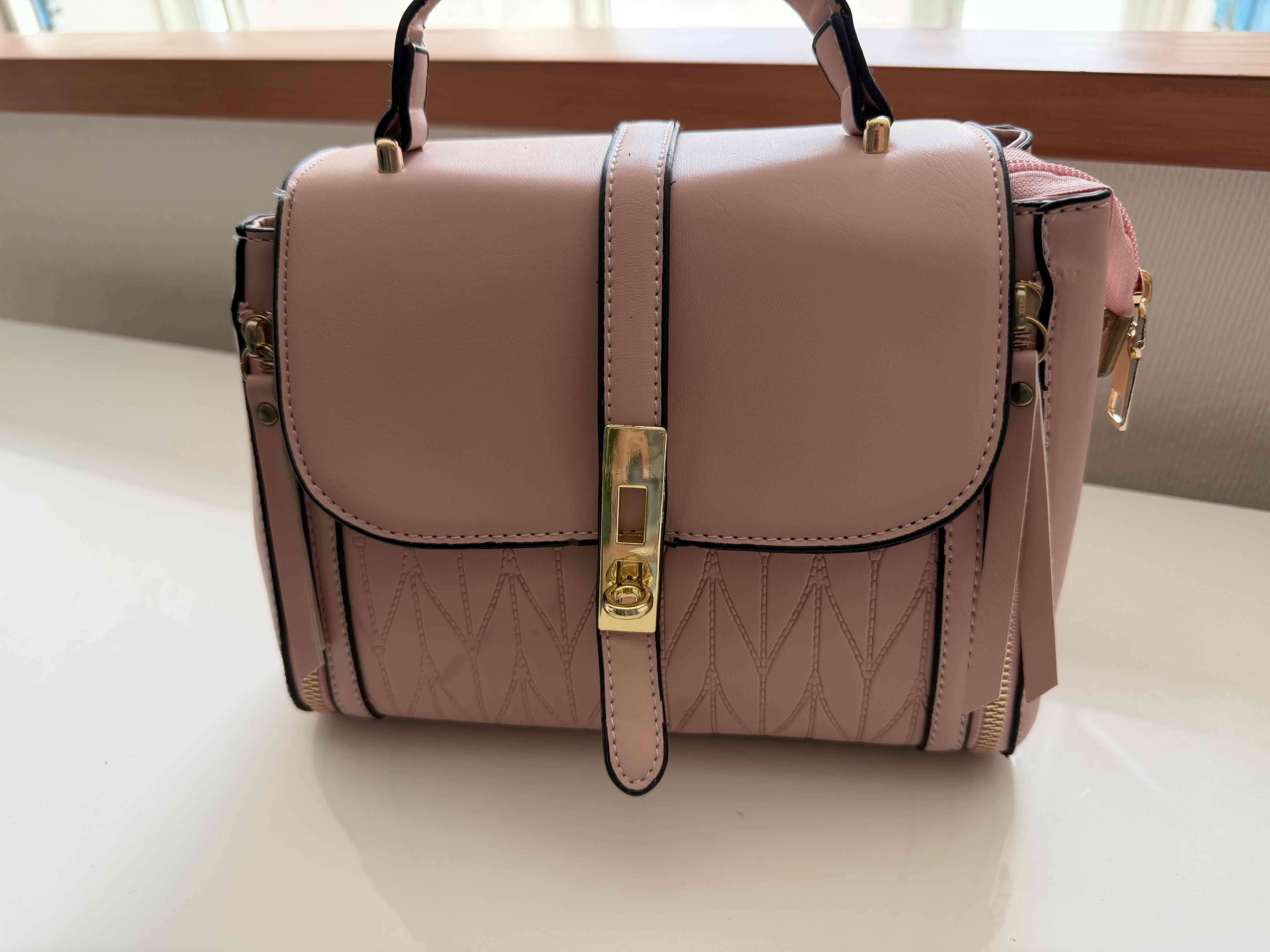 Bolso de mano color rosa con detalles dorados, elegante y moderno. Ideal para uso diario o eventos especiales.