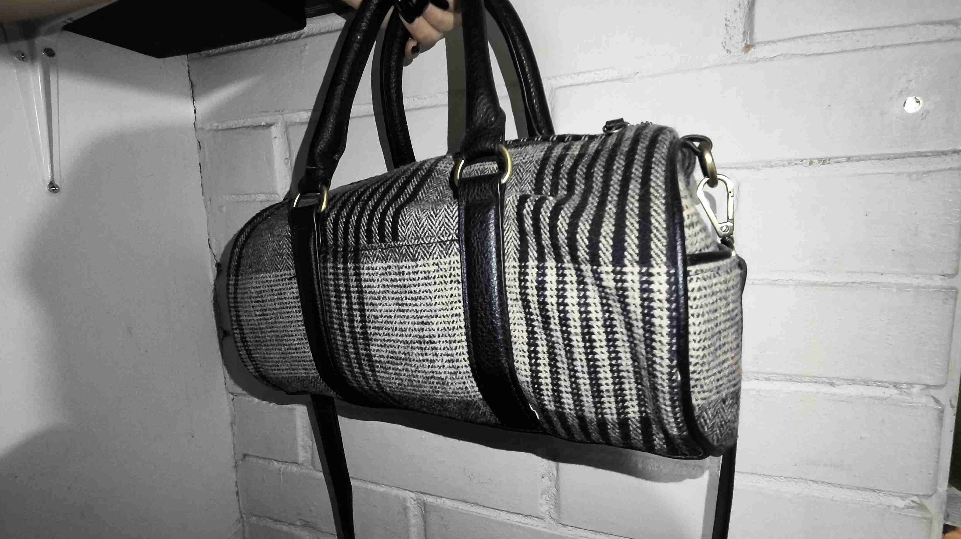 Bolso elegante con diseño a rayas y asas negras. Perfecto para uso diario o salidas casuales. Tamaño mediano a pequeño, con tirante para utilizarlo cruzado.