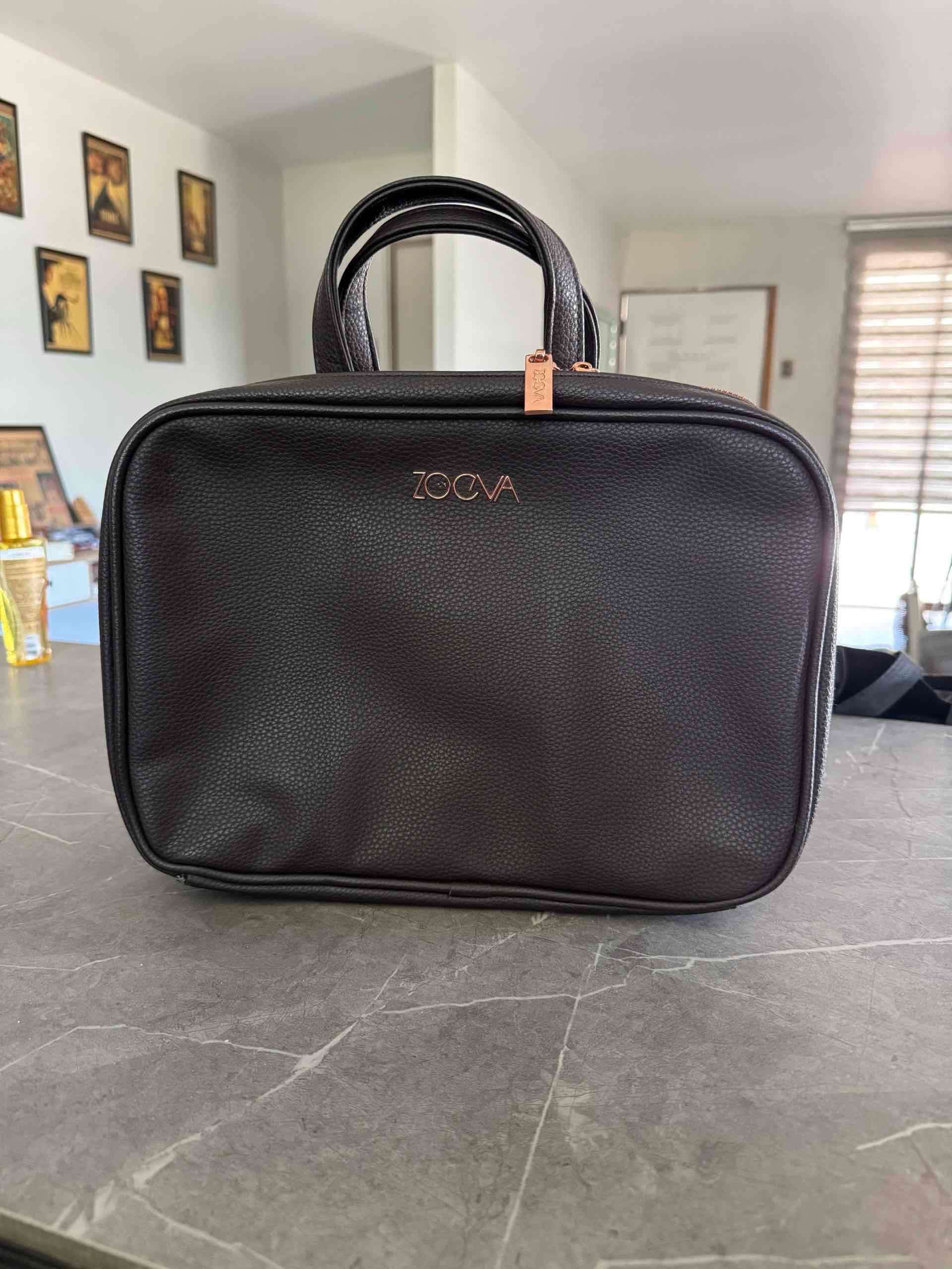 Elegante bolso cafe con detalles en oro rosa de la marca ZOEVA, ideal para transportar maquillaje y brochas, con diferentes compartimentos. Incluye bolsa protectora para el bolso