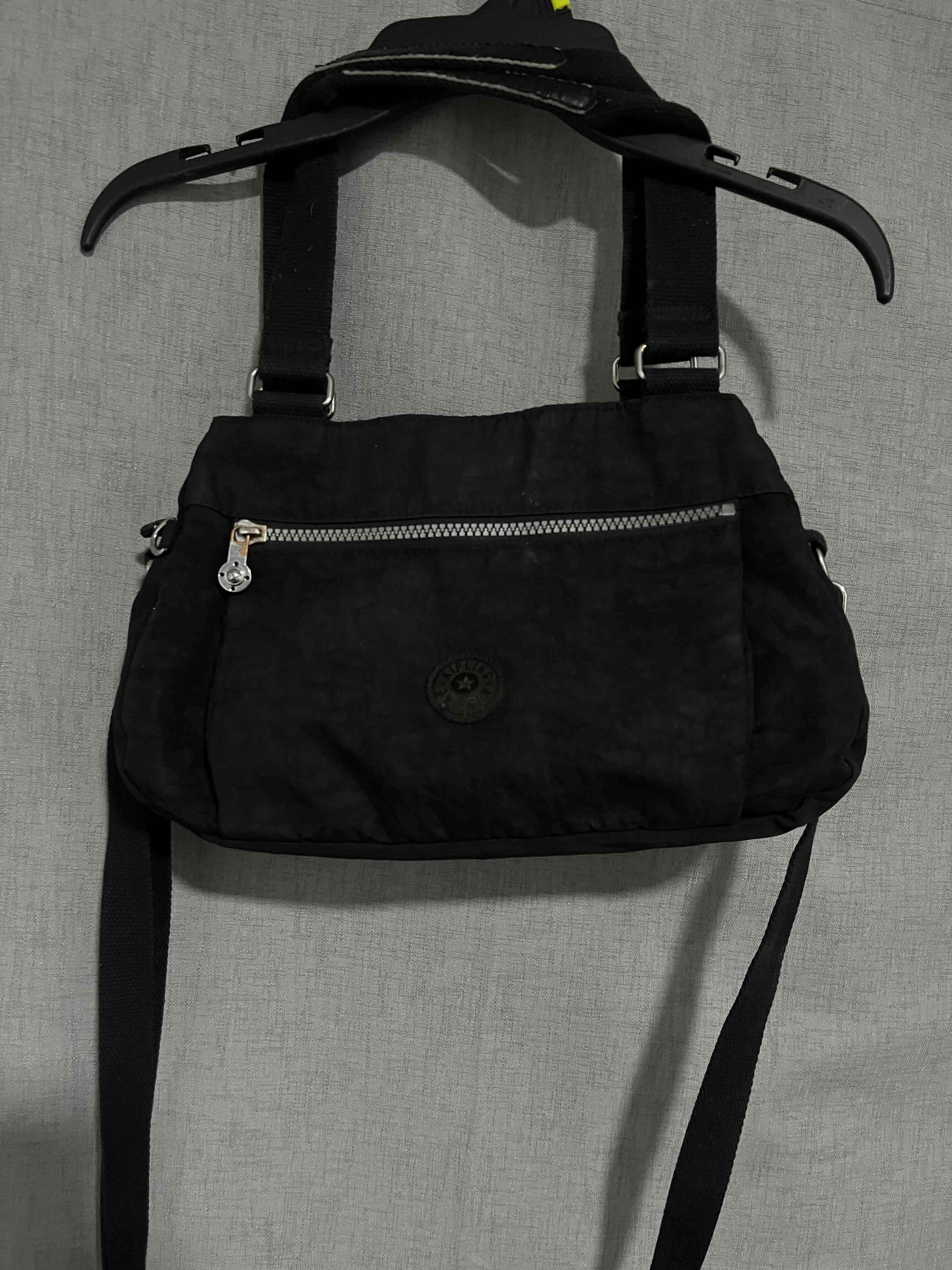 Bolso de tela negra con correas ajustables y un práctico bolsillo delantero con cierre. Ideal para uso diario. Solo falta una lavada.