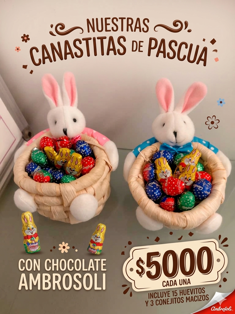 Lindas canastitas de Pascua con chocolates Ambrosoli, ideales para regalar. Cada una incluye 15 huevitos y 3 conejitos macizos.