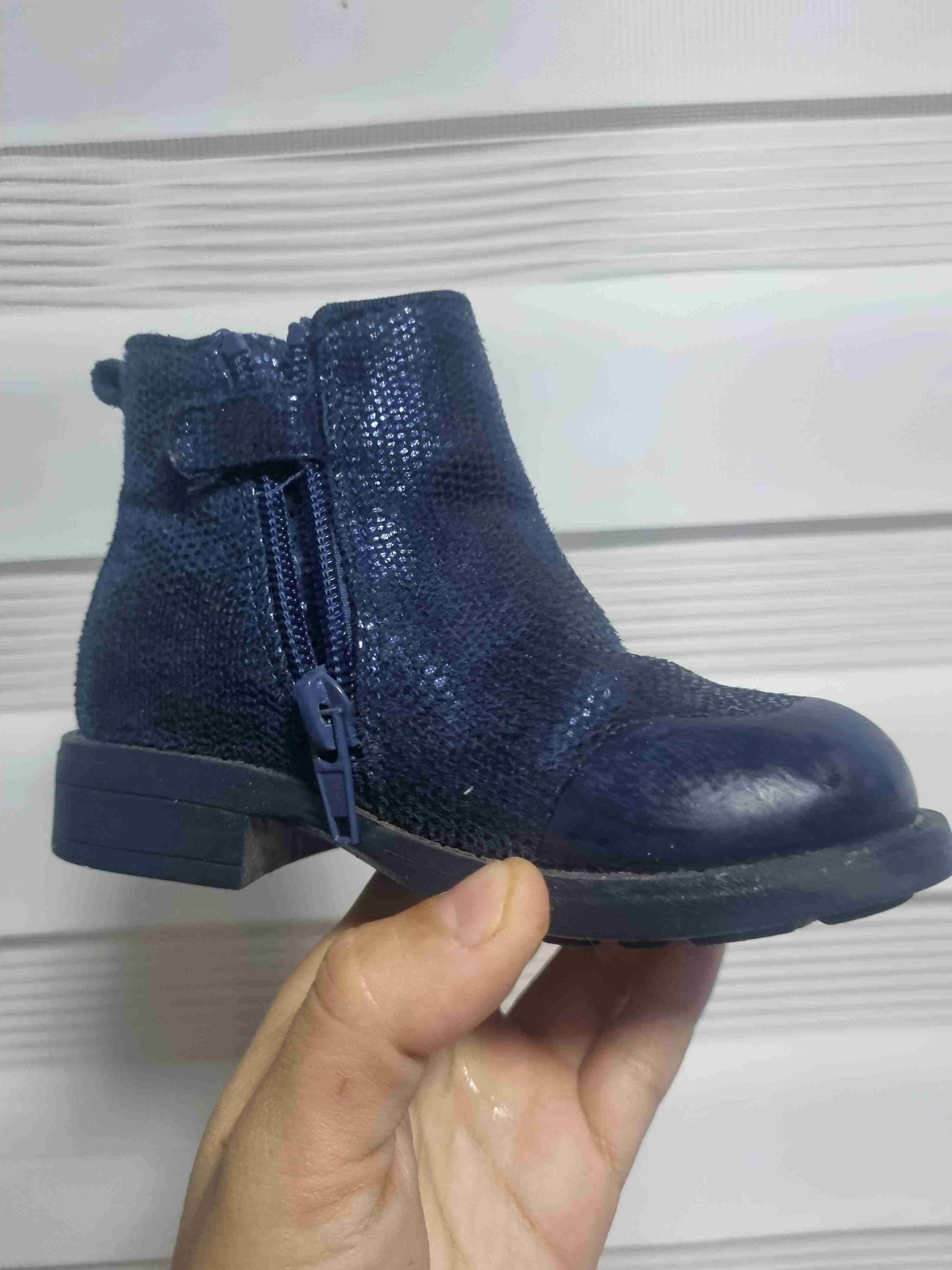 Botín azul metálico para niña, con cierre lateral. Buen estado general, ideal para invierno.