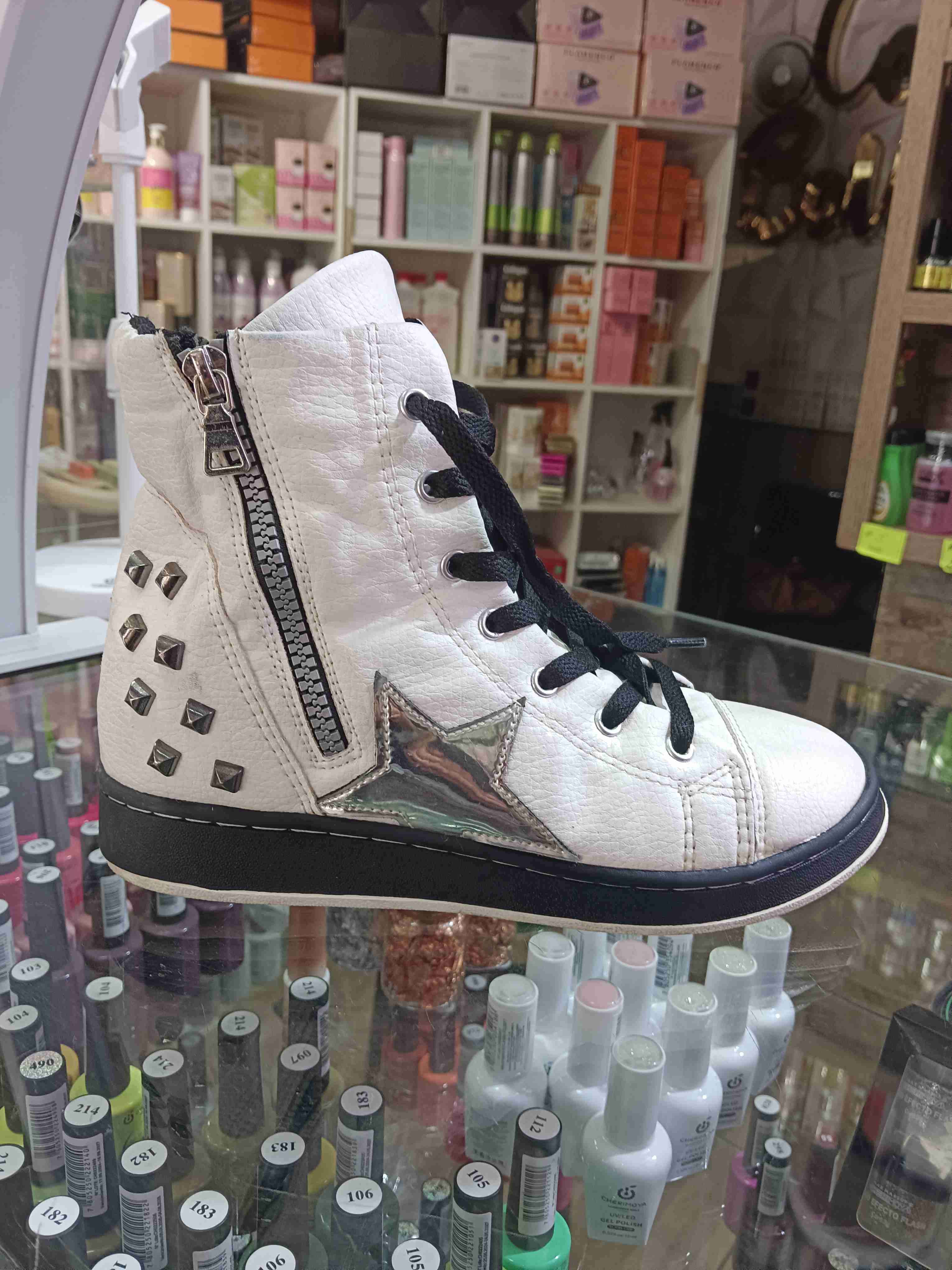 Botín para niños, color blanco con adornos de estrellas y tachas, perfectos para un look moderno. Cierre lateral y cordones. Buen estado.